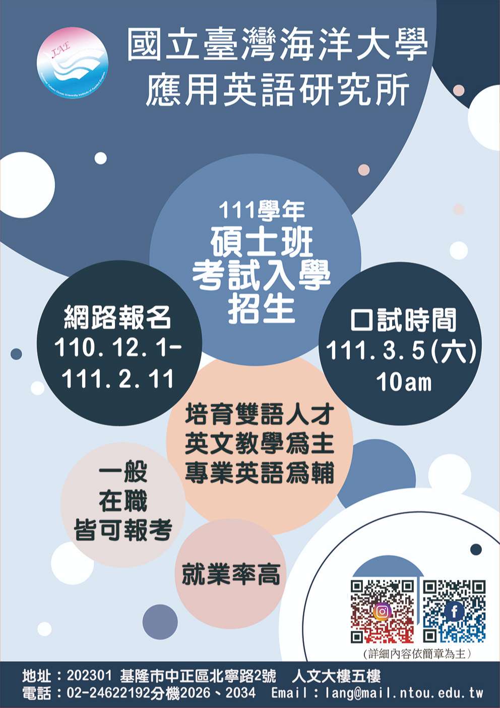 一、本校應用英語研究所111學年度碩士班(甄試入學及考試入