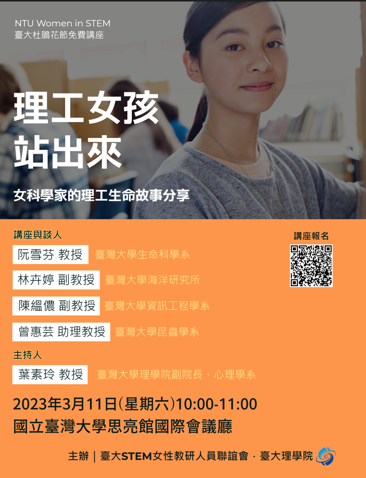 一、為鼓勵女同學於中學時期學涯性向探索之際,對S— Science(科學)、T—Technology(技術)、E—Engineering (工程)、M—Mathematics(數學)有進一步的認識,並啟發 其興趣,由臺灣大學STEM女性教研人員聯誼會(NTU Women in STEM)及理學院邀請本校相關學科女性教授分享其理工生命 經驗,與對「理工女孩」議題有興趣的國高中師生及家長 一同交流,歡迎踴躍報名。