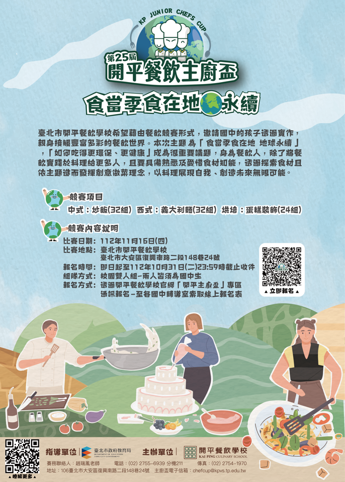九、相關比賽辦法,報名資訊隨函檢附,詳細比賽資訊請參閱 第25屆主廚盃網頁(https://sites.google.com/kpvs.tp. edu.tw/kpvsjcc)或逕洽聯絡人:趙瑞鳳老師,連絡電話: 02-2755-6939轉211