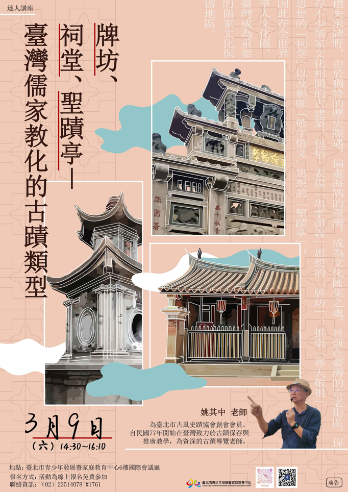 臺北市青少年發展暨家庭教育中心3月9日14:30舉 辦壯遊達人開講「牌坊、祠堂、聖蹟亭—臺灣儒家教化 的古蹟類型」,姚其中老師領讀臺灣古蹟之美,提昇青 年學子對臺灣古建築的欣賞能力。活動免費,詳見青發 家教中心官網。