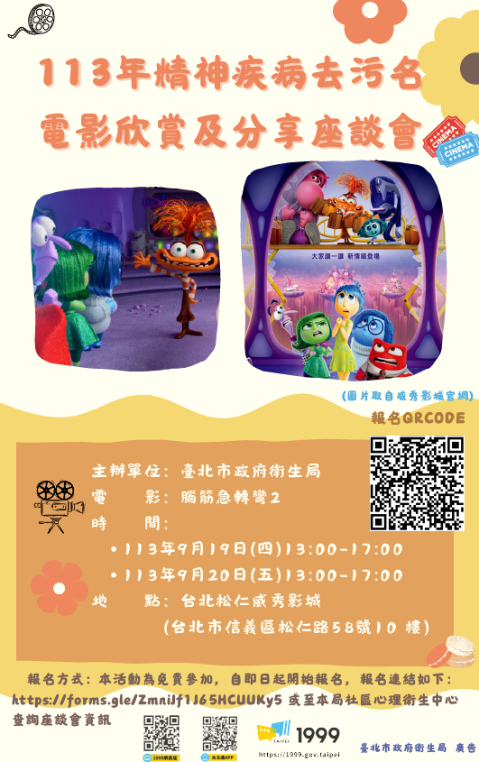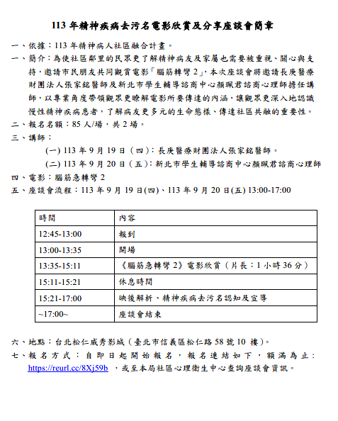 自即日起開始報名,報名連結如下,額滿為止: https://reurl.cc/8Xj59b,或至台北市政府衛生局社區心理衛生中心查 詢座談會資訊。