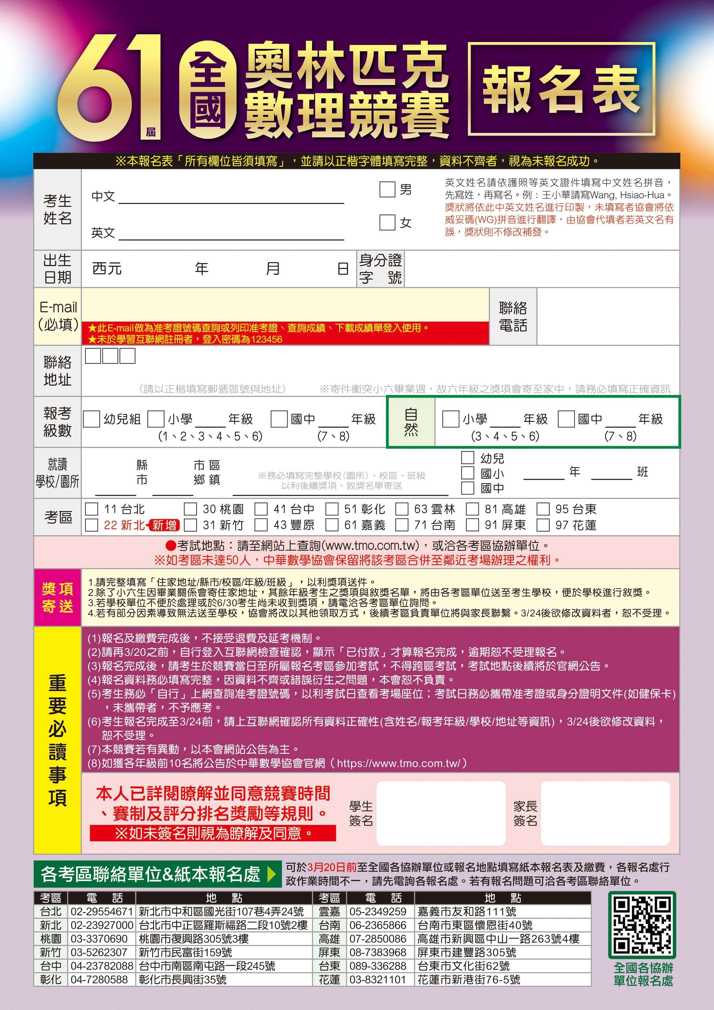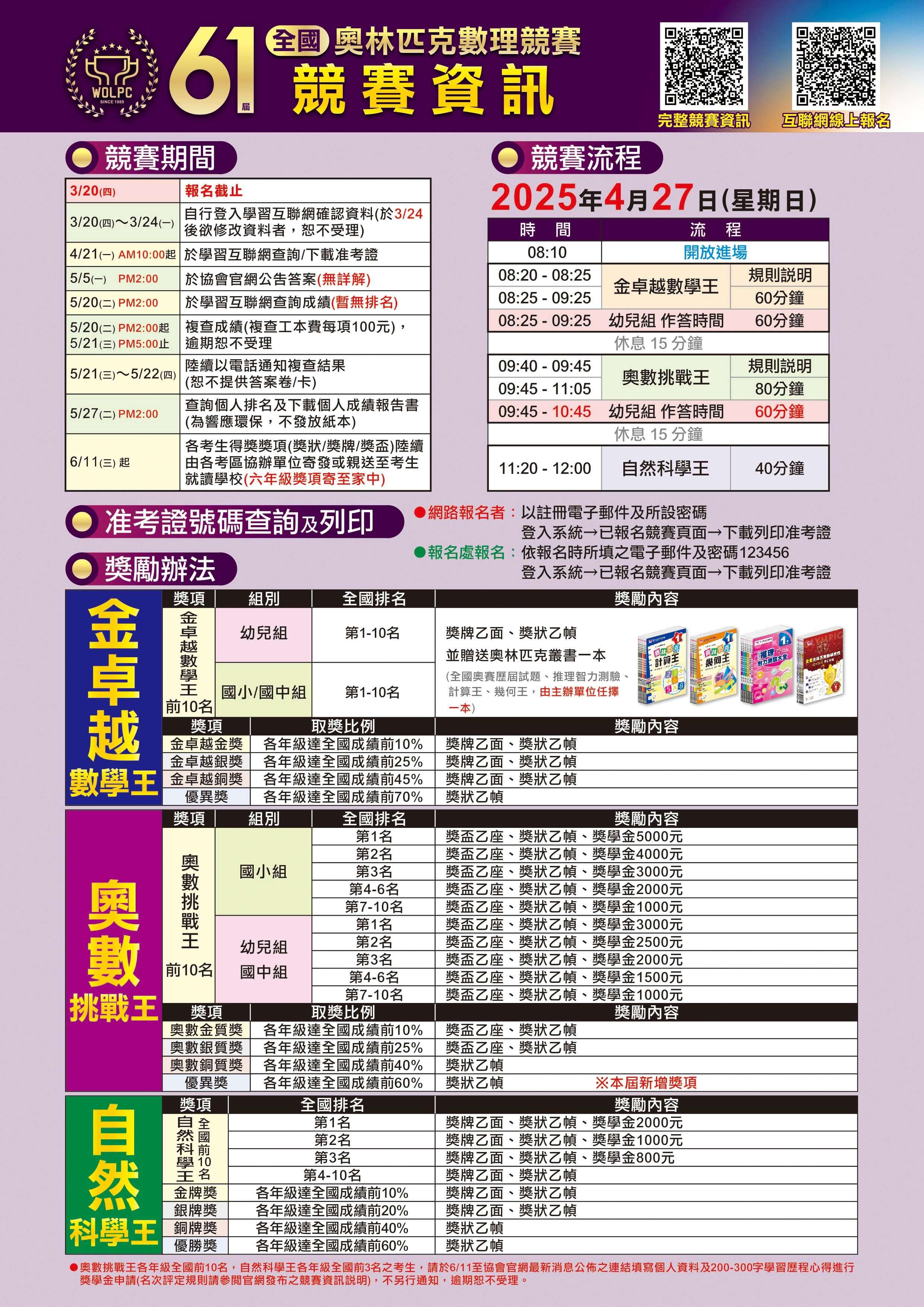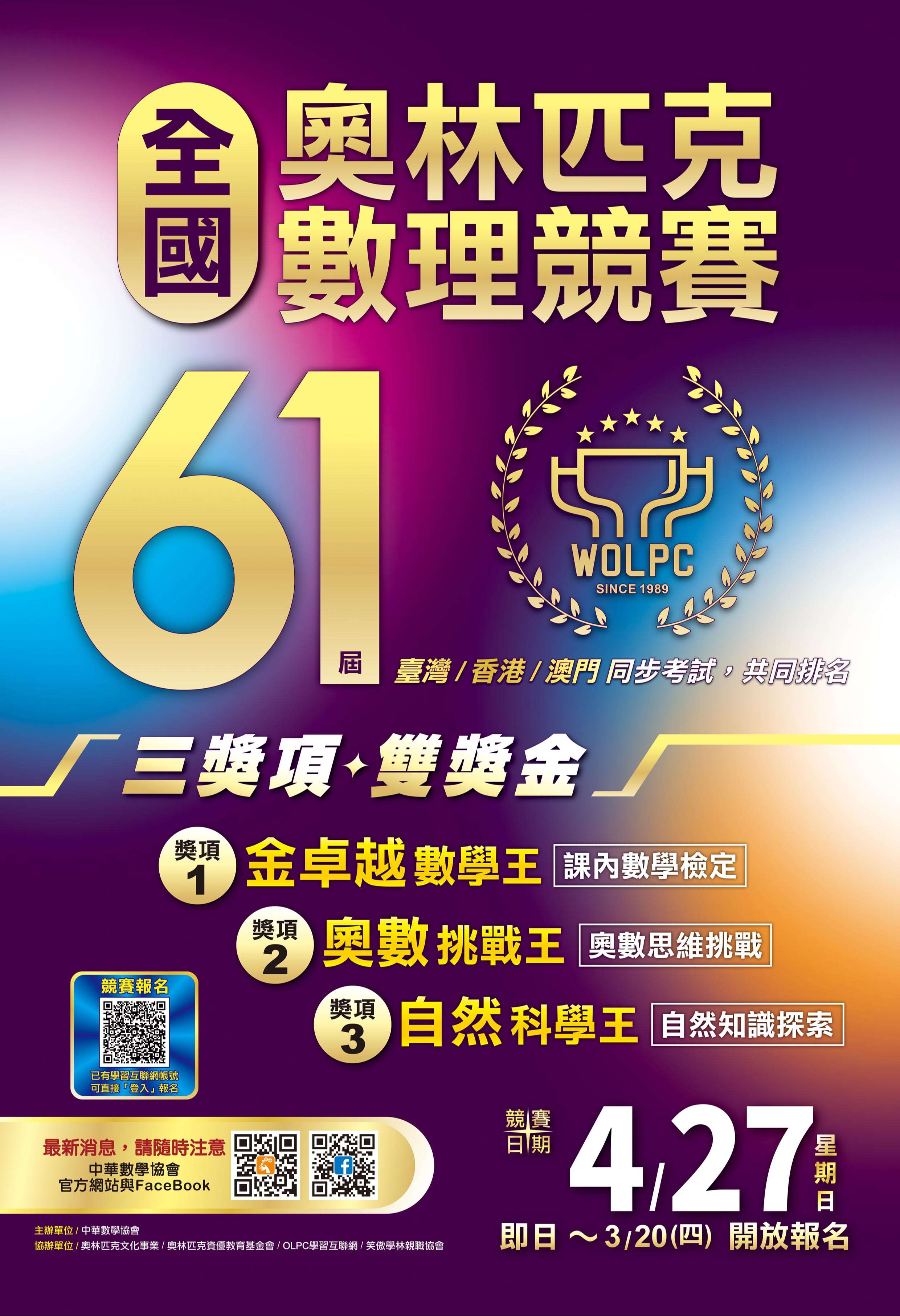 謹訂於114年4月27日( 星期日) 舉辦 「第61屆全國奧林匹克數理競賽」