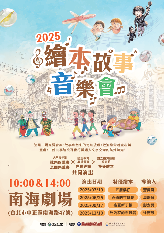 「2025年繪本故事音樂會」訂於114年3月19日(星期 三)、6月25日(星期三)、9月17日(星期三)及12月10日(星期三)等4日上午10時及下午2時,共計8場次,於該 館南海劇場(臺北市中正區南海路47號)演出,歡迎學校 師生踴躍報名。