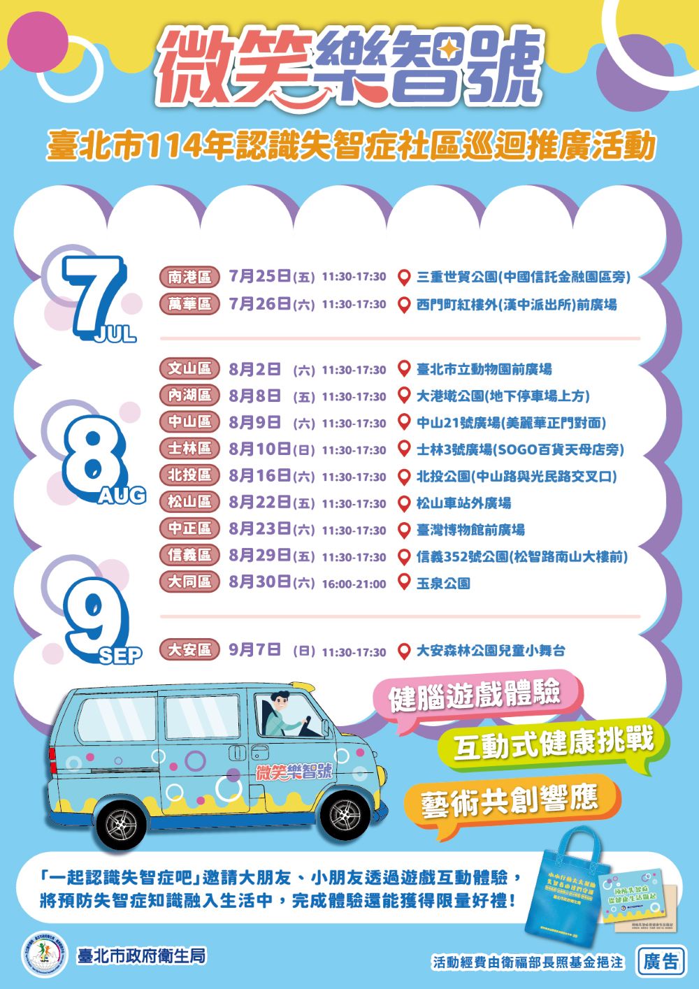 為增加民眾對失智症的認識及預防,本局114年結合「微笑樂智號」胖卡車,規劃「健腦遊戲體驗」、「互動式健康挑戰」、「藝術共創響應」等多元內容,巡迴本市十二行政區,藉由趣味互動吸引民眾參與,將失智症知識融入生活中。鼓勵民眾踴躍參加。