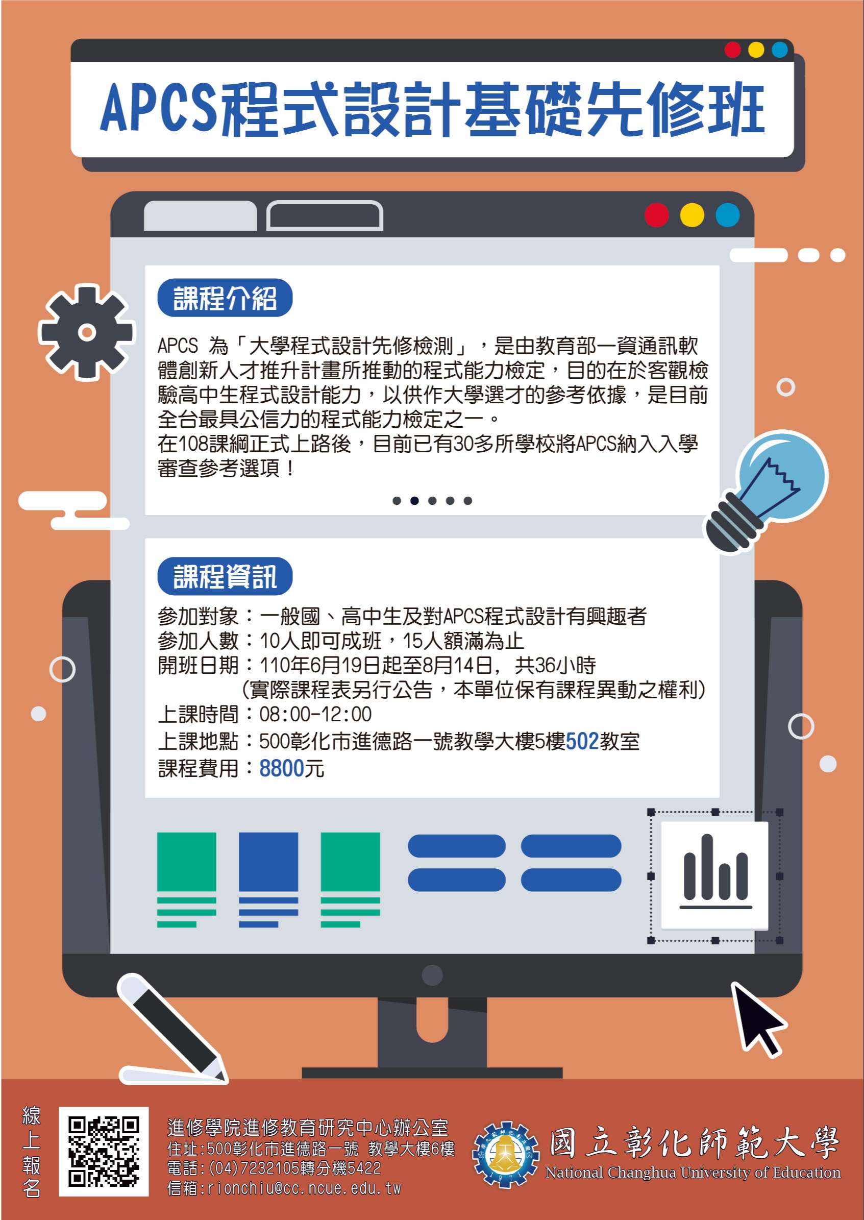 一、「APCS程式設計基礎先修班」課程時間為110年6月19日~8月14日(每週六)8:00-12:00,合計36小時,課程費用每人8,800元,即日起受理報名至110年6月4日(星期五)或額滿為止,如有課程相關問題,請逕向課程承辦人 洽詢:04-7232105轉分機5422 邱小姐。