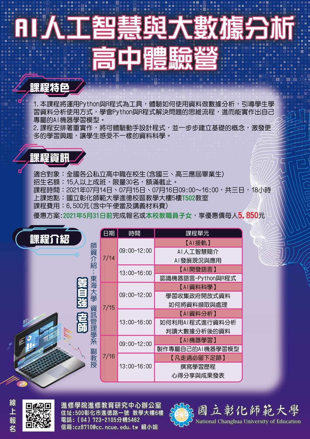 二、「AI人工智慧與大數據分析高中體驗營」課程時間為110年7月14~16日9:00-16:00,共3日,合計18小時,課程費用每人5,850元(含中午便當及講義材料費),即日起受理報名至110年6月27日(星期日)為止,如有課程相關問題,請逕向課程承辦人洽詢:04-7232105轉分機5462 賴小姐。