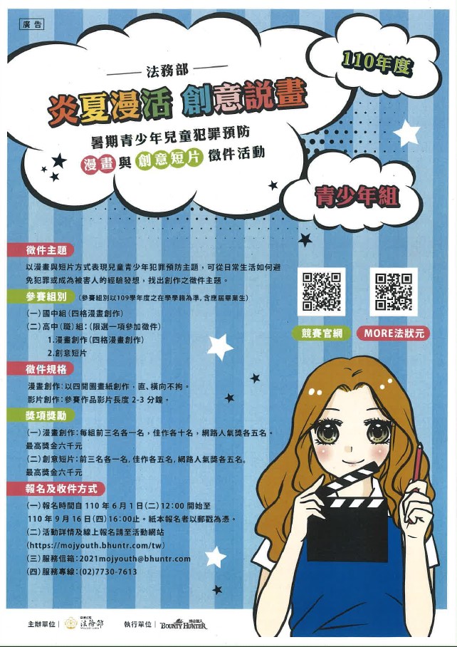 相關徵稿活動相關資訊及報名資料下載,請至法務部活動網站(https://mojyouth.bhuntr.com/tw)、該部「More法狀元」網站(https://tpmr.moj.gov.tw)年度活動項下查詢或facebook搜尋:More法狀元-兒童及青少年犯罪預防宣導網。