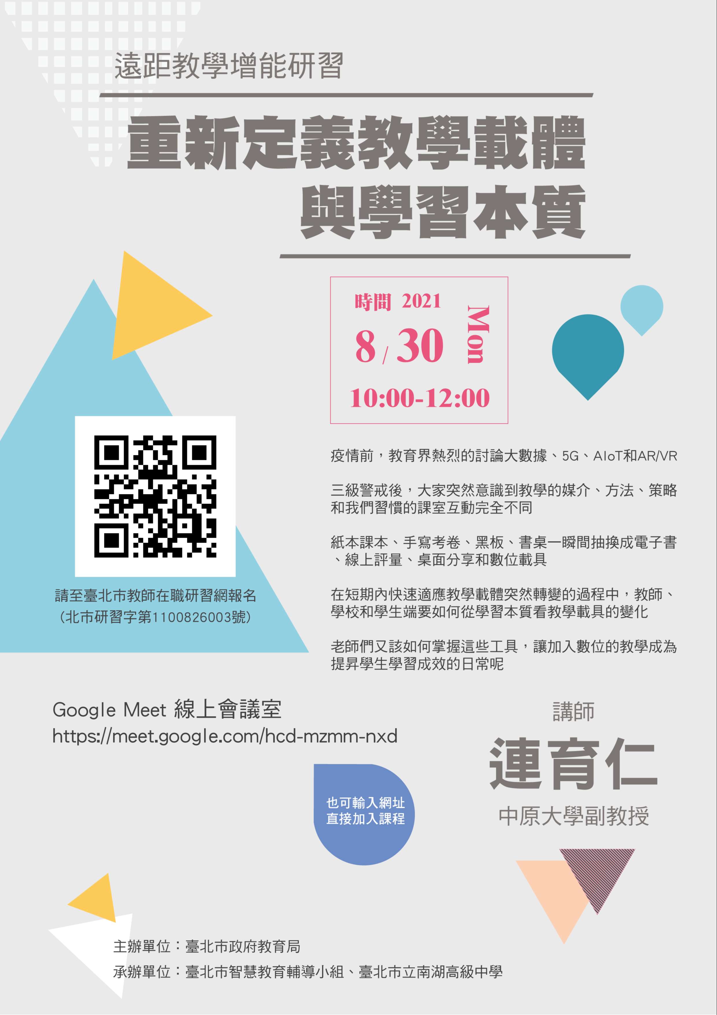 二、本案研習相關資訊說明如下: (一)課程主題:重新定義教學載體與學習本質。 (二)授課講師:中原大學華語文教學中心連育仁副教授。 (三)研習時間:110年8月30日(星期一)上午10時至12時。 (四)研習地點:Google Meet 線上會議室(網址: https://meet.google.com/hcd-mzmm-nxd)。 (五)報名時間:即日起至110年8月29日(星期日)止。 (六)報名方式:請逕至臺北市教師在職研習網(網址: https://insc.tp.edu.tw/)報名,核准文號:北市研習 字第1100826003號。