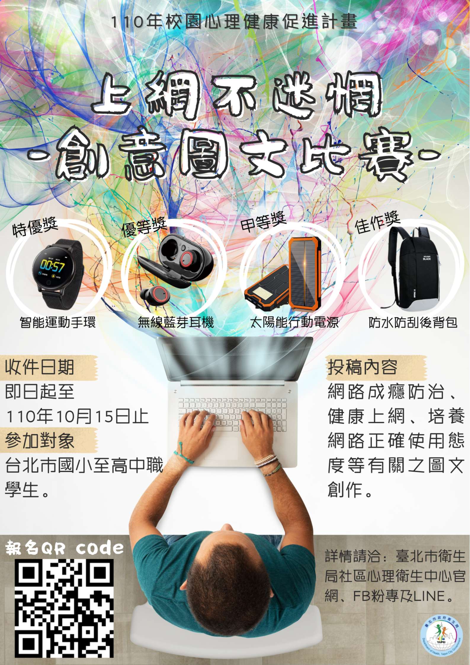2、主題內容及創作方向:以網路成癮防治、健康上網及培養網路正確使用態度等觀念,發揮個人創意以結合文字及圖像。