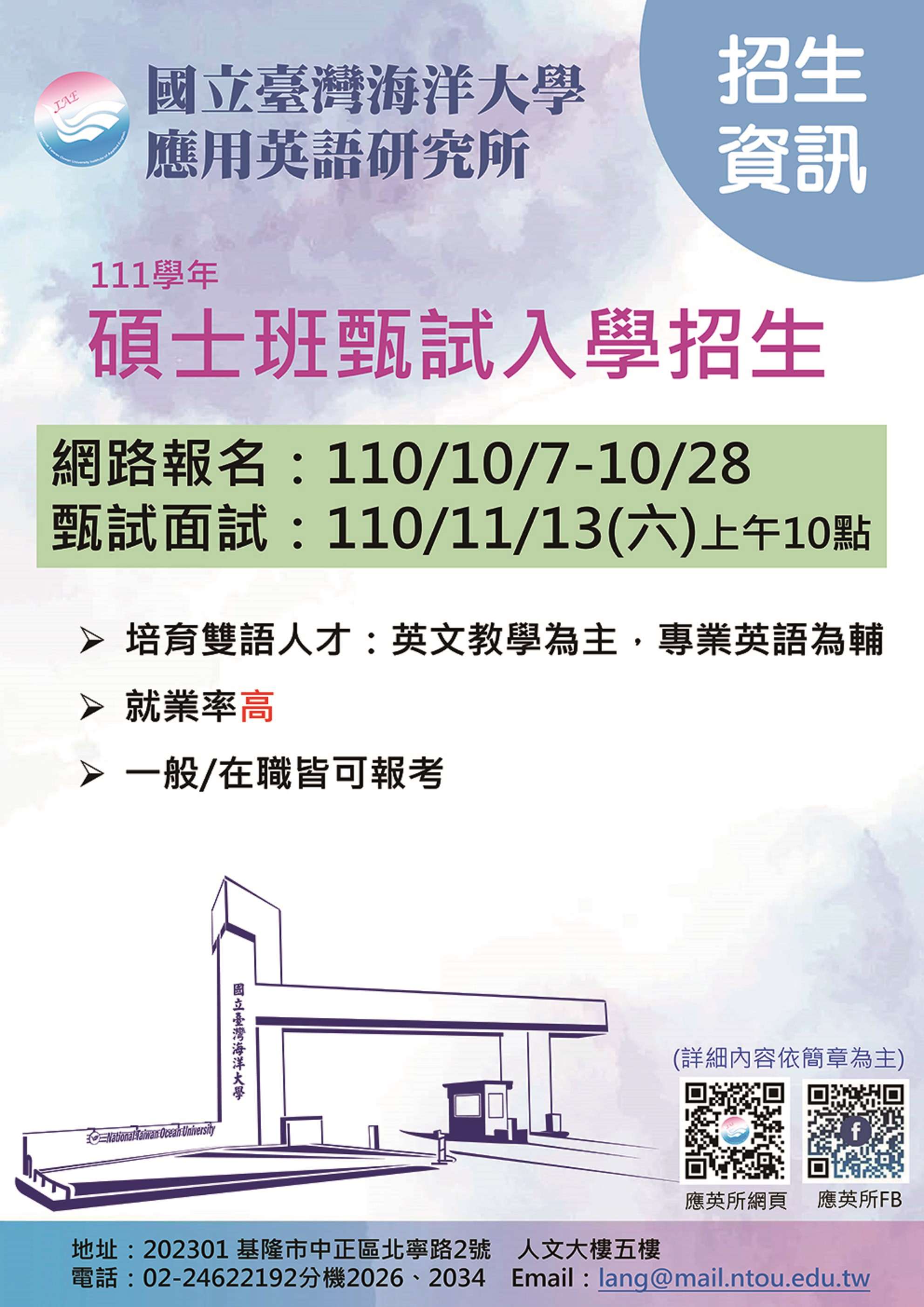 二、本校應用英語研究所111學年碩士班招收一般生和在職生共
