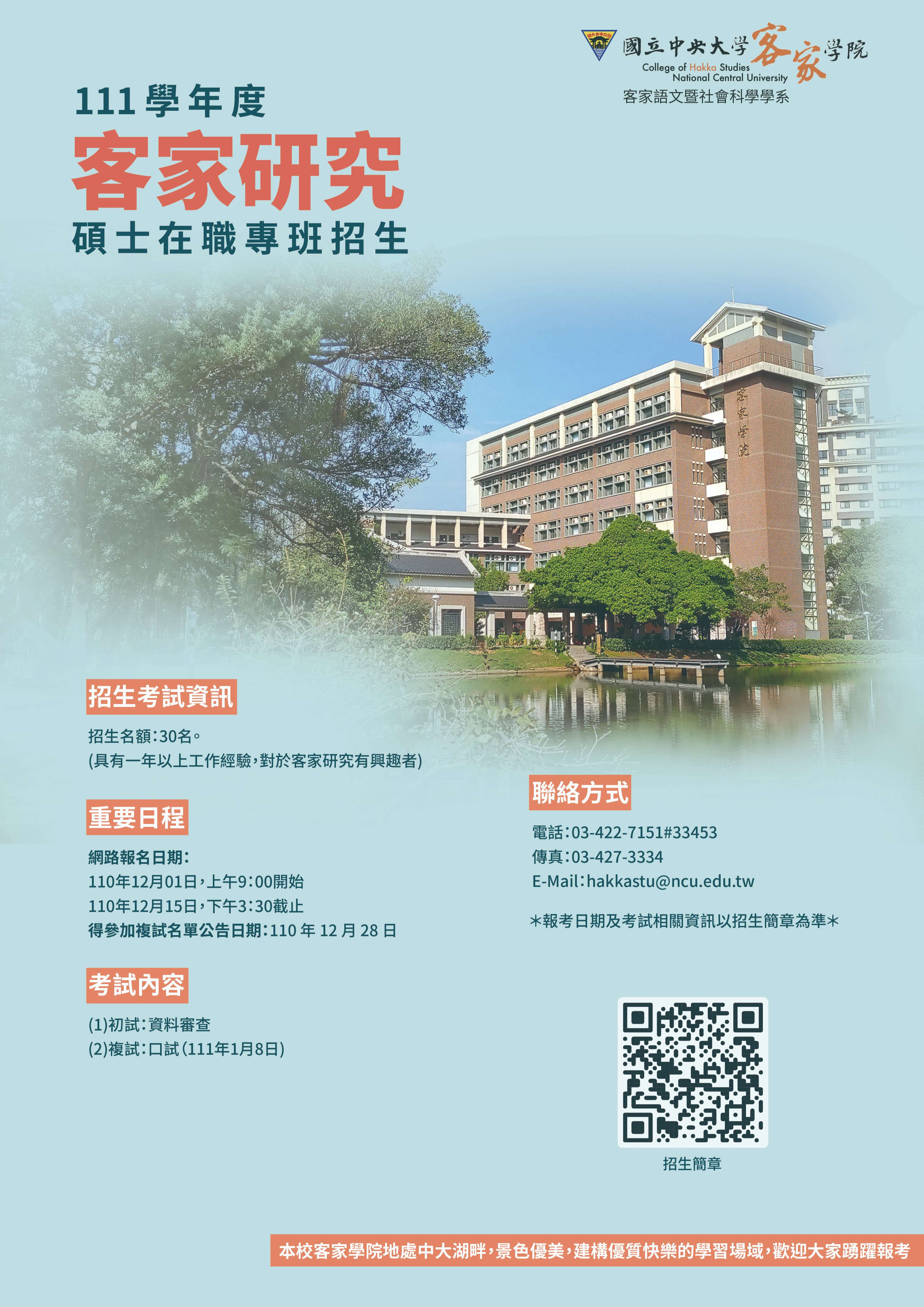 一、本校客家語文暨社會科學學系「客家研究碩士在職專班」