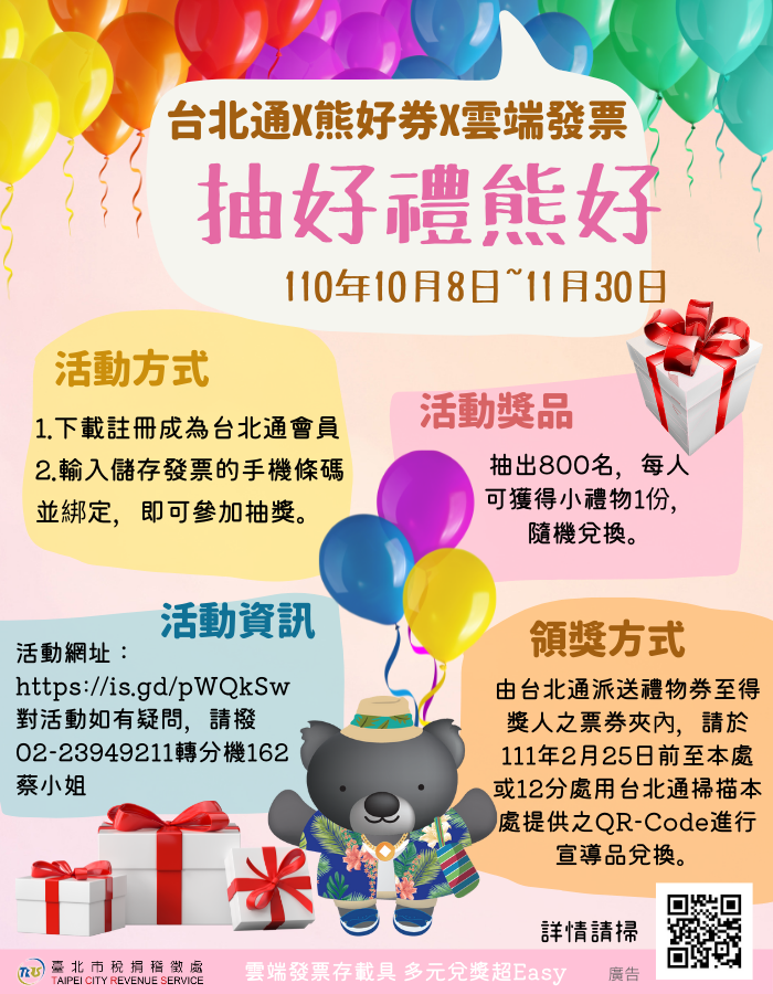 二、活動方式:活動期間下載註冊成為台北通會員,並於台北 通APP輸入手機條碼並綁定,即可參加抽獎,有機會可獲得 精美小禮物1份,共800名;活動結束抽獎後,禮物券將派 送到中獎人台北通的票夾中,得獎人可於111年2月25日前 至本處及所屬分處兌換宣導品。