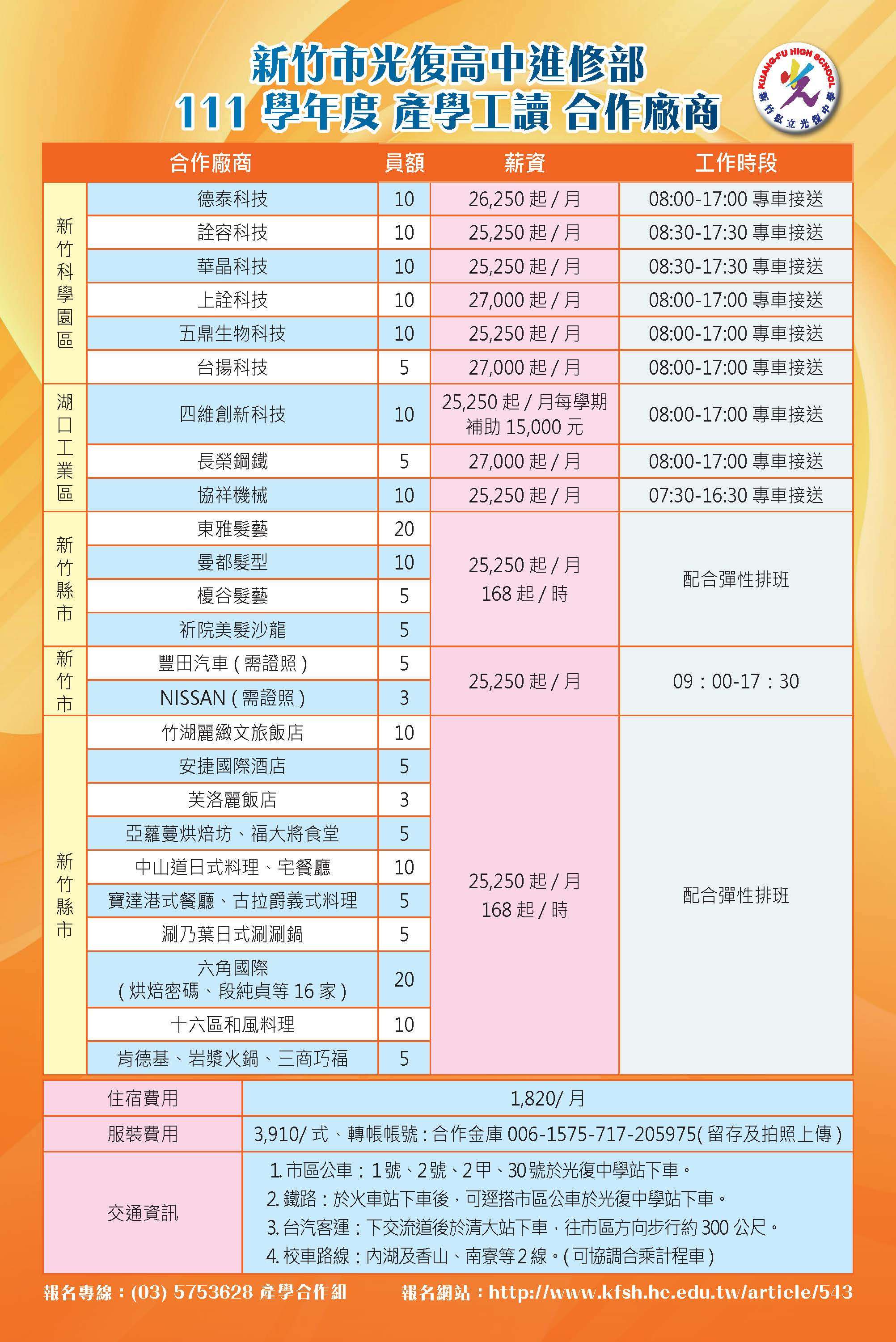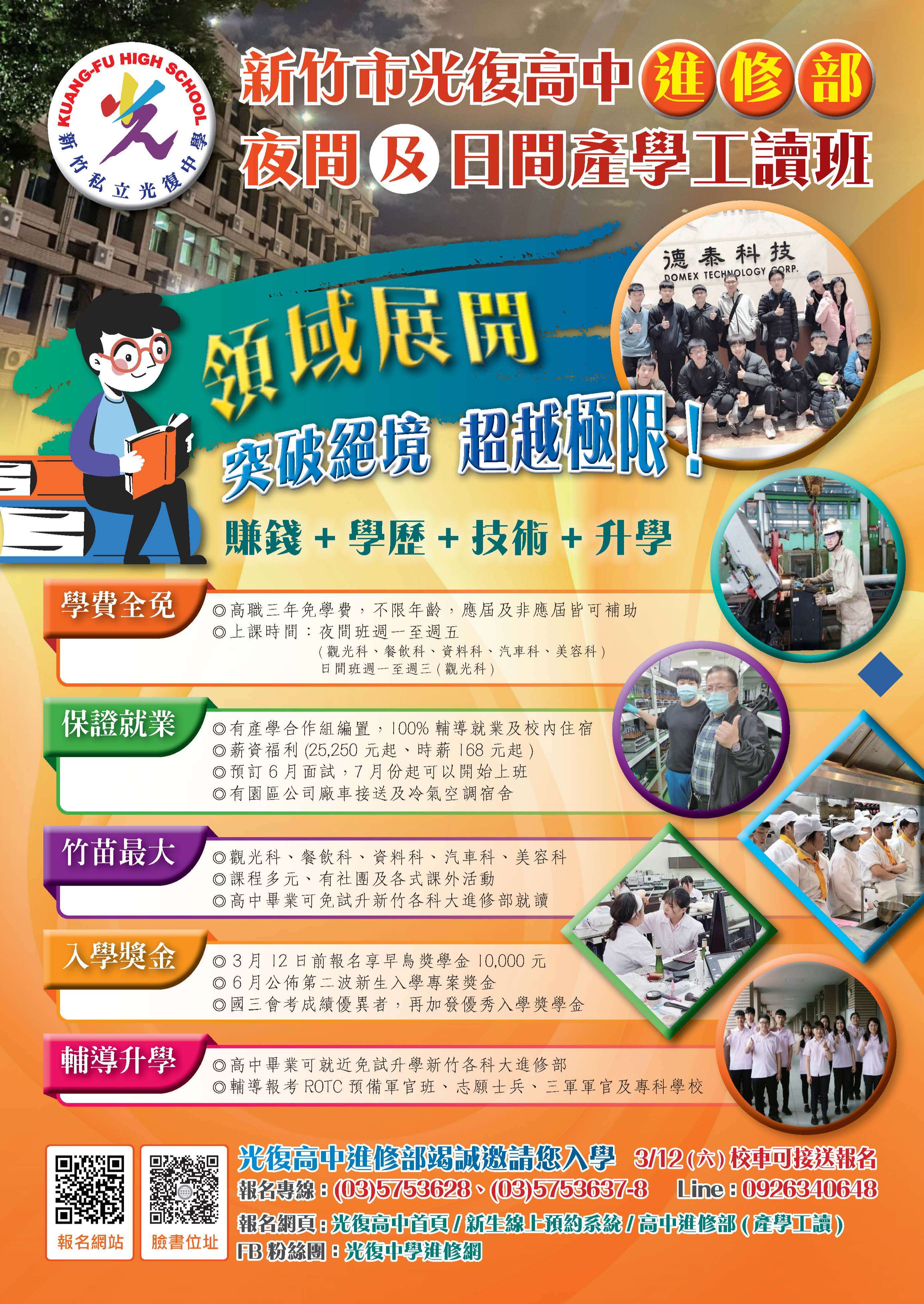 (一)請協助將資料轉知適性學生,由學生網路預約,由本校回電說明。電話:03-5753628及03-5353637,報名預約請搜尋//光復高中首頁/新生線上預約系統/進修部(產學工讀)。http://www.kfsh.hc.edu.tw/article/543。