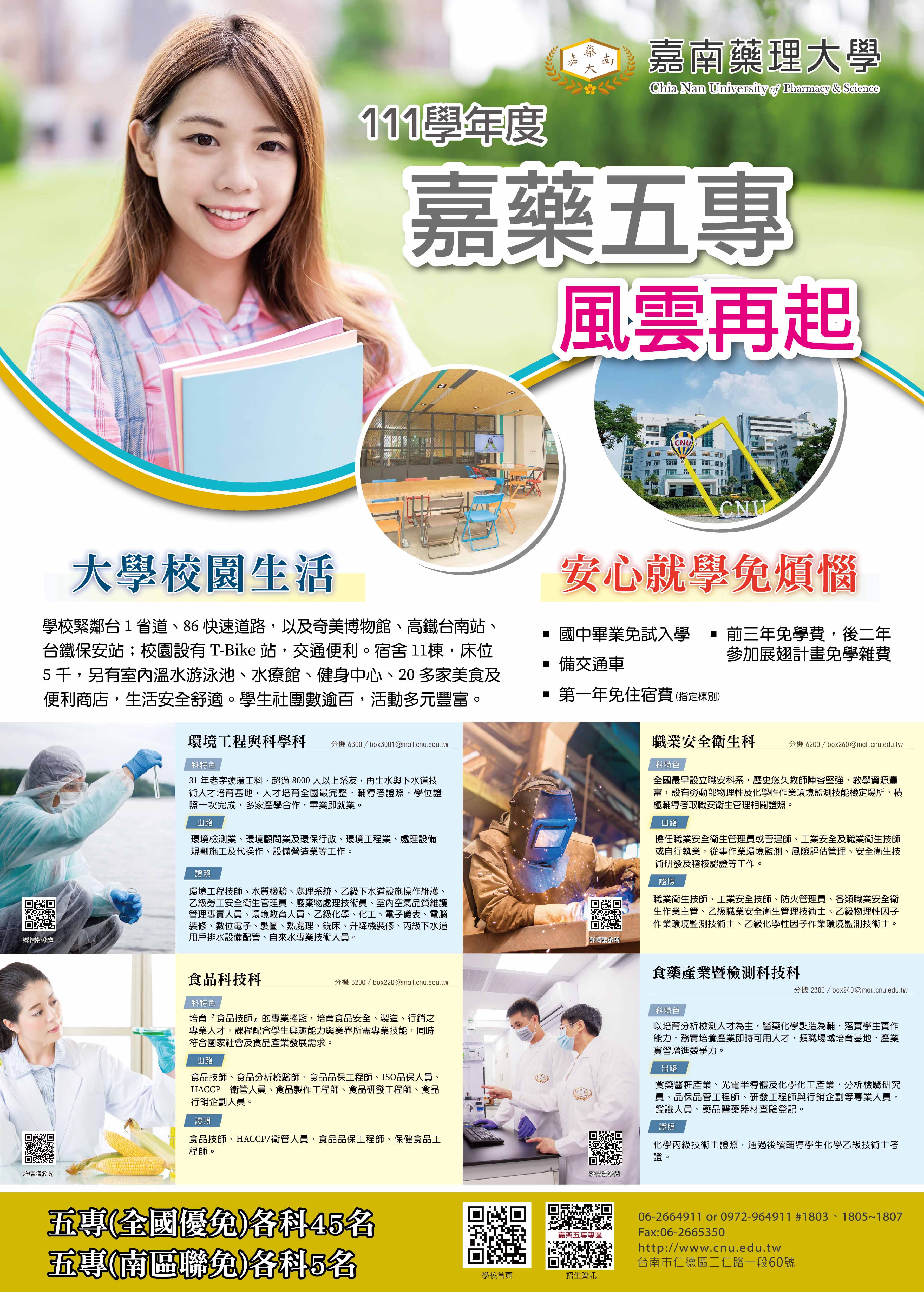 嘉南藥理大學111學年度五專學制,招收環境工程與科學科、職業安全衛生科、食品科技科、食藥產業暨檢測科技科等計4科,招生資訊海報如附件,如有任何疑義,請逕洽該校承辦人:卓姸希(聯絡電話:06-2664911分機1806)。