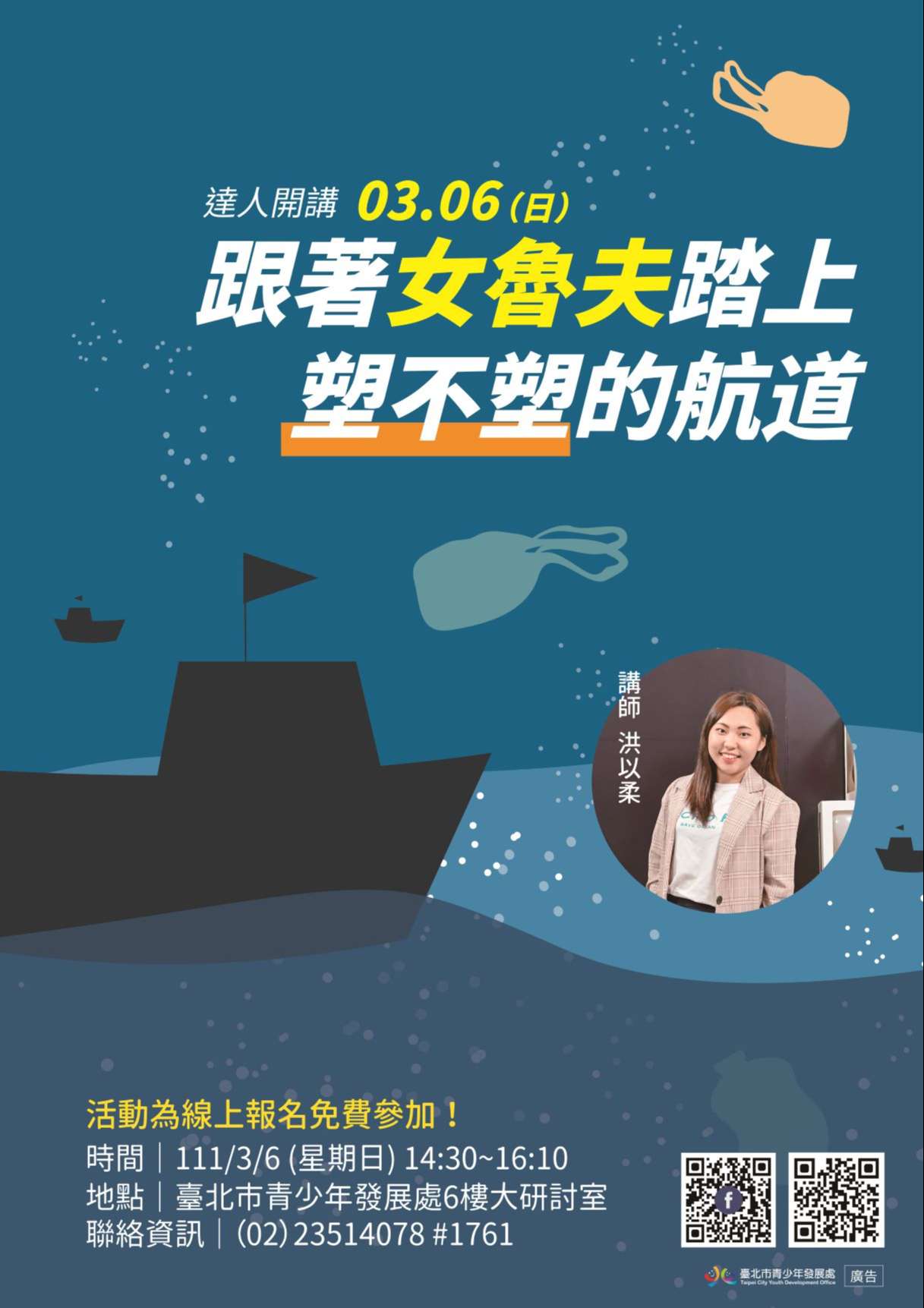 臺北市青少年發展處3月6日14:30舉辦壯遊達人開 講「跟著女魯夫踏上塑不塑的航道」,洪以柔老師與您 分享她海洋減塑的歷程,以及過程中的挑戰。活動免 費,詳見青發處官網。