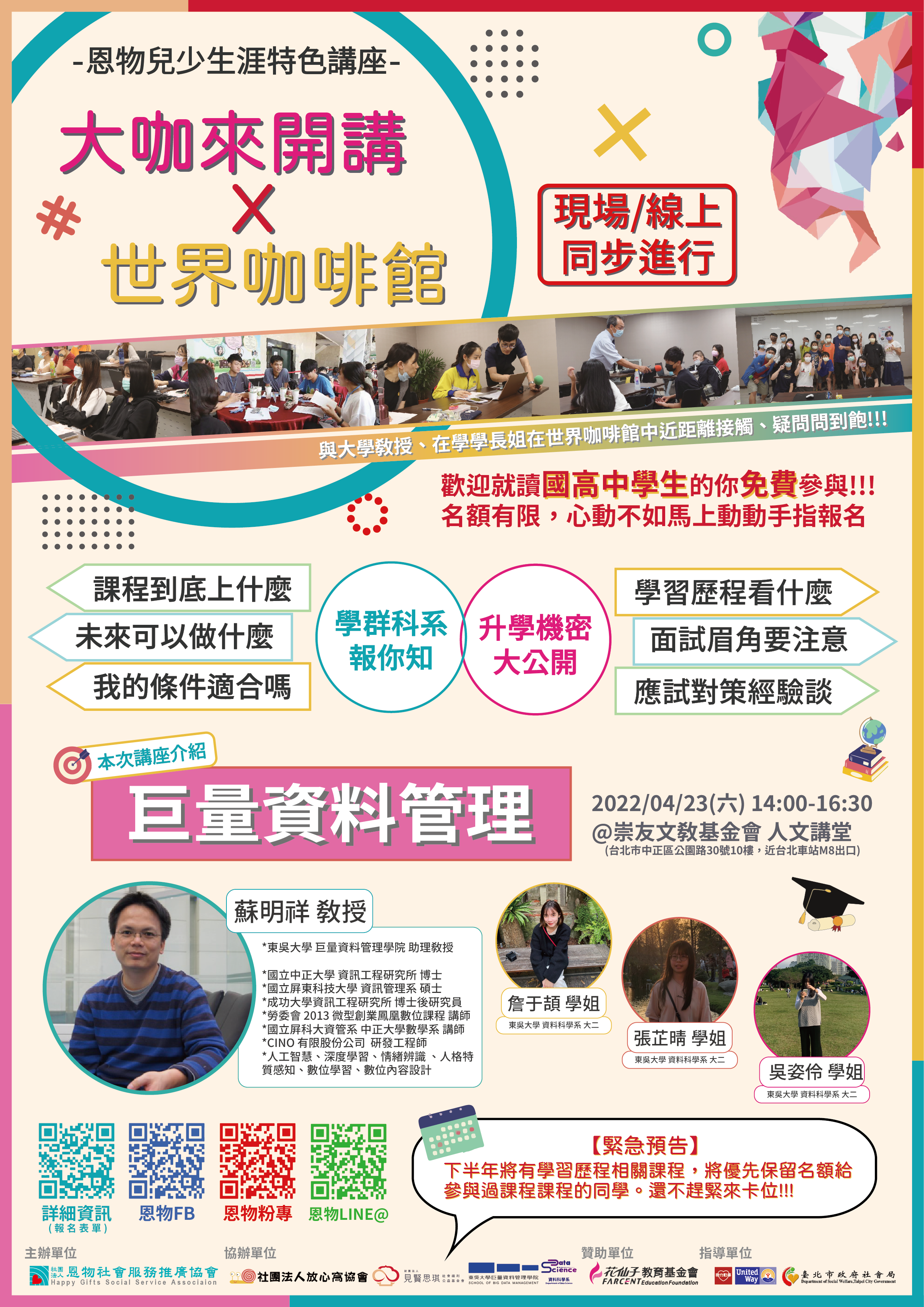 五、系列講座費用免費,提供「研習時數證書」電子檔。