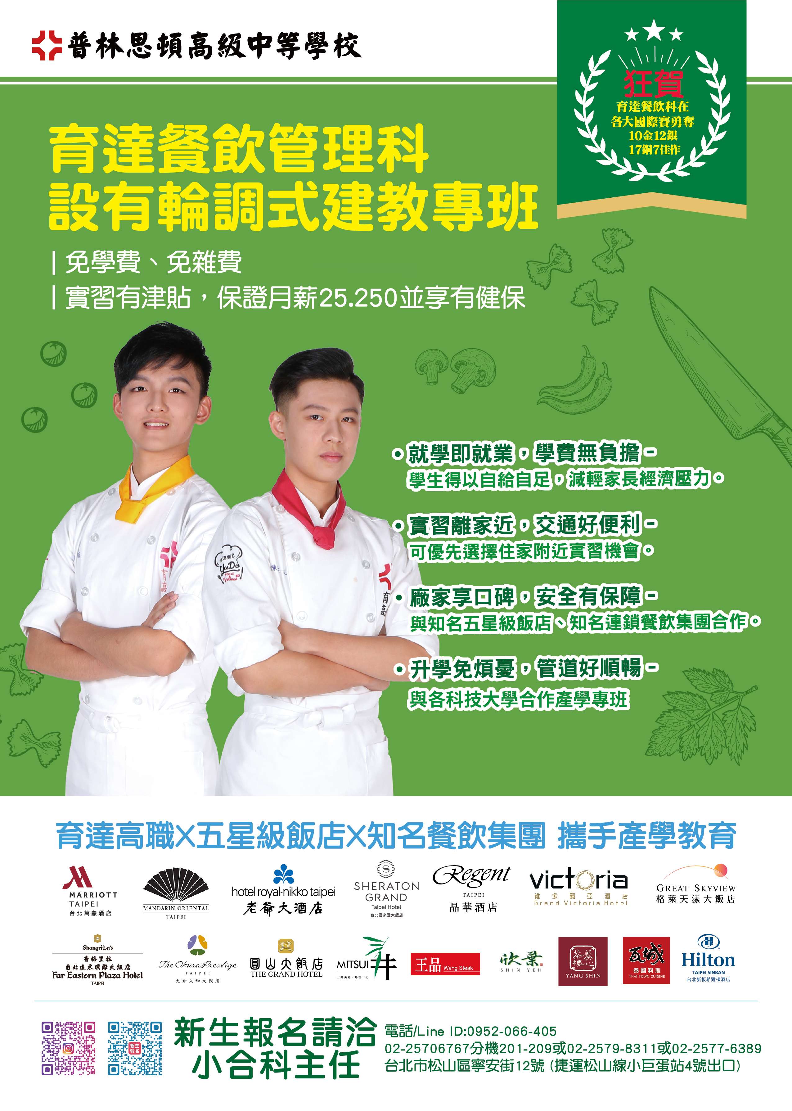 一、本校餐飲管理科與五星大飯店(晶華酒店、台北喜來登大飯店、台北萬豪酒店..)與知名連鎖產業(王品集團、欣葉國際餐飲集團、瓦城泰統集團..)合作,品牌大有保障。