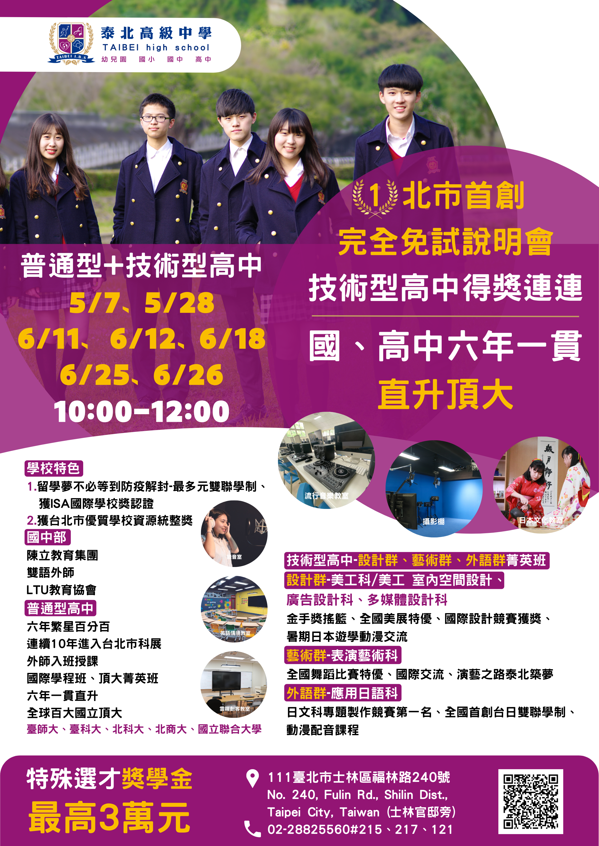二、辦理時程:111年5月7日(星期六)(完全免試入學說明會)、111年5月28日(星期六)(免試入學家長說明會)10:00-12:00。