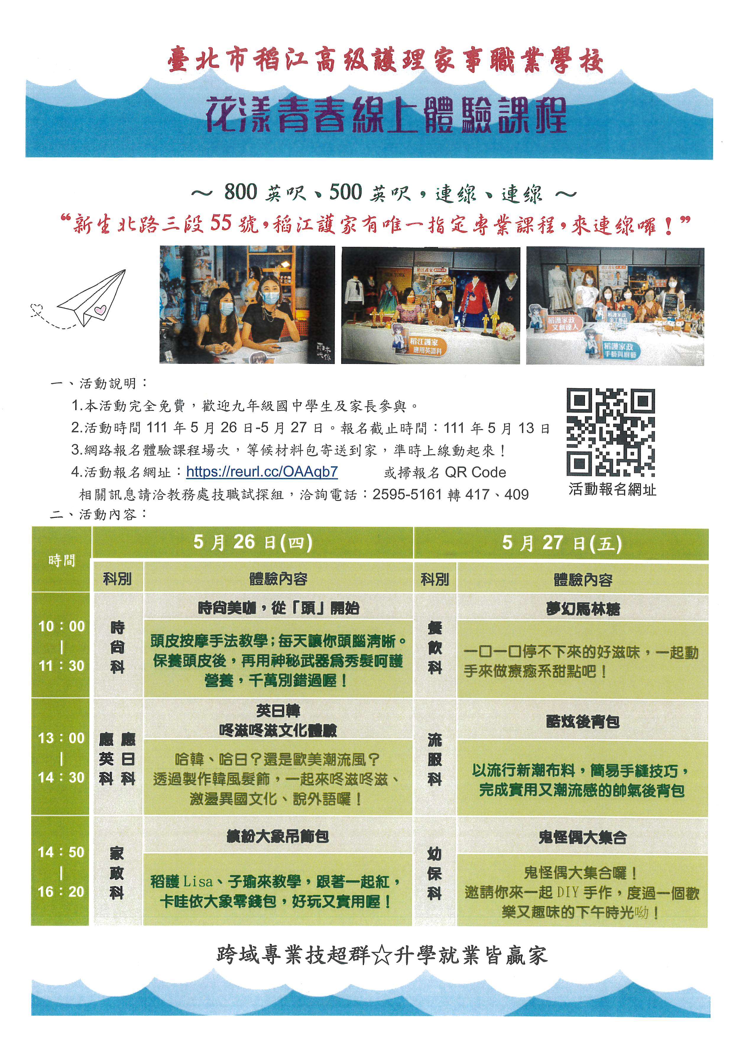 二、配合防疫不停學,本校規劃於111年5月26日(四)、5月27日(五)辦理線上體驗課程,讓學生跟著線上老師做中學,清楚認識科系特色。