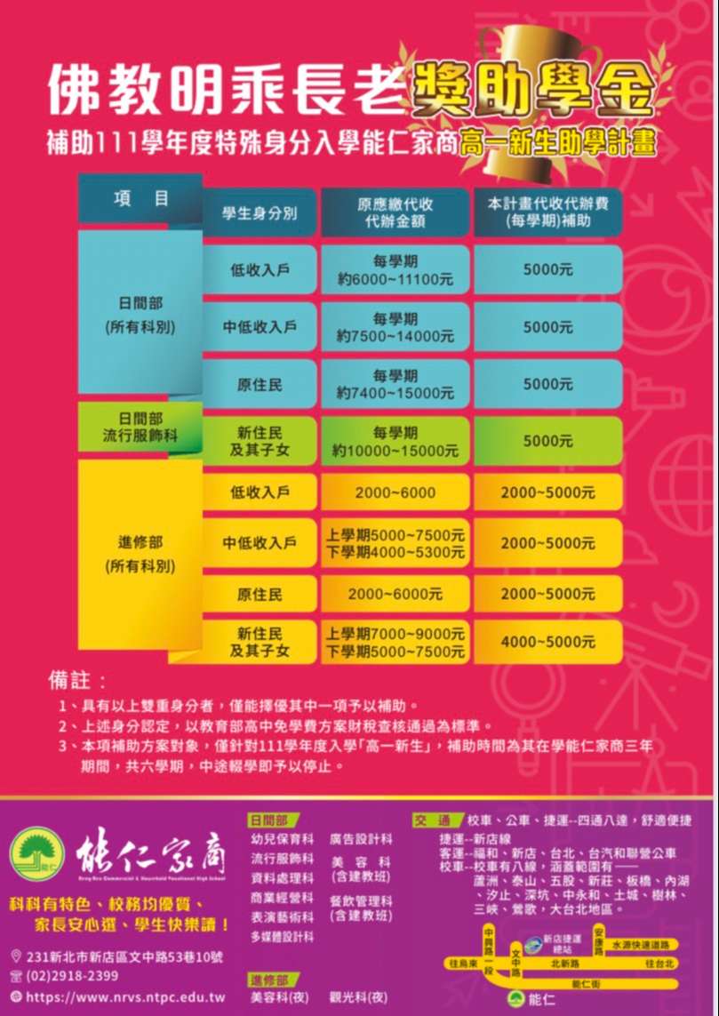 一、依據本校「佛教明乘長老獎助學金—補助111學年度特殊身分學生入學能仁家商高一新生助學計畫」辦理。