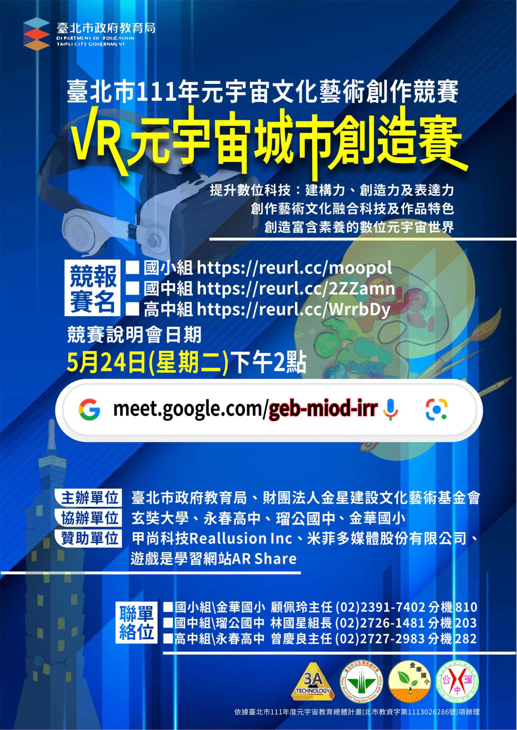 臺北市111年元宇宙文化藝術創作競賽:VR元宇宙城市創造賽定於5月24日(二)下午2:00 4:00線上辦理競賽說明會,說明會網址為 meet.google.com/geb-miod-irr。
