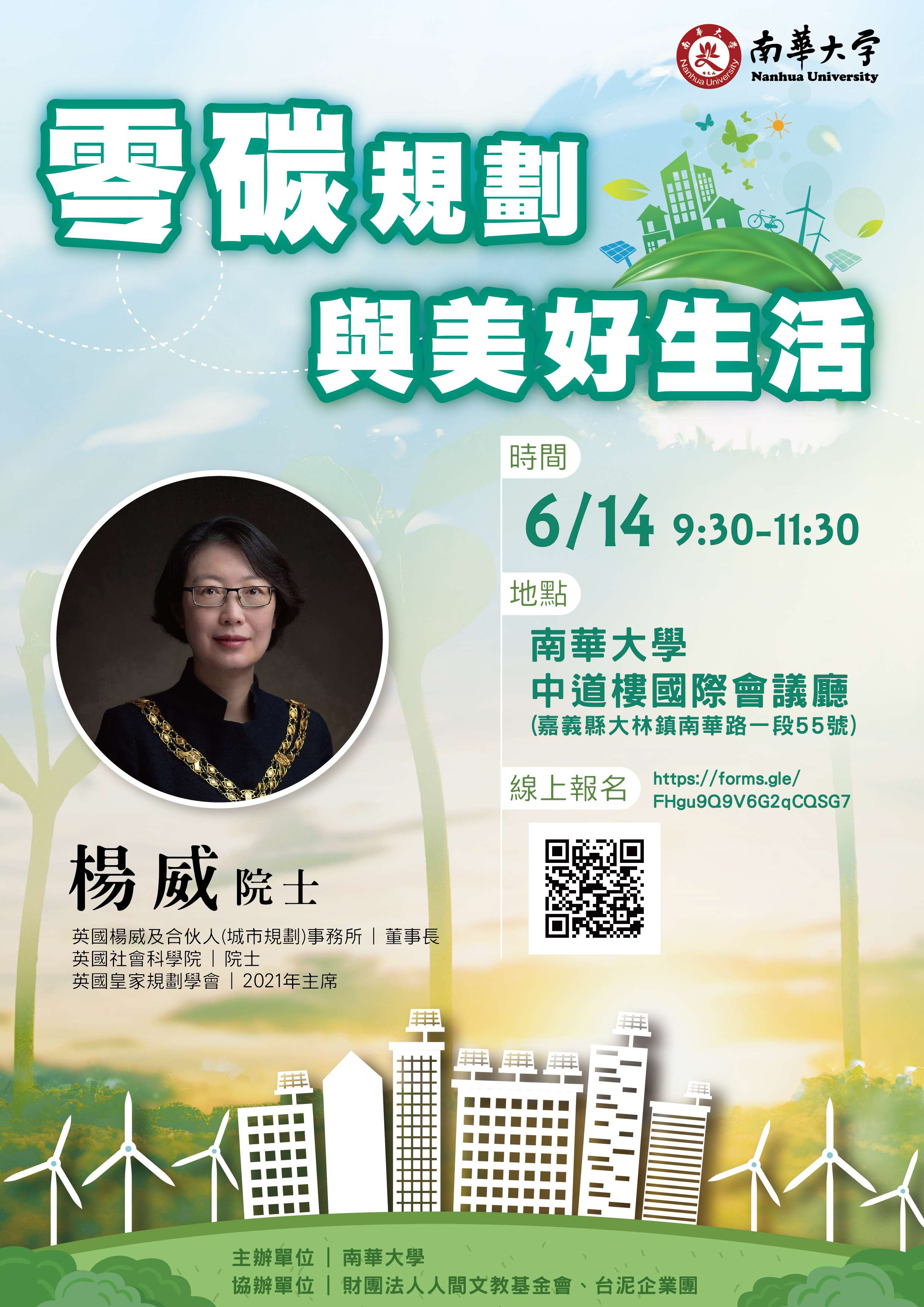 南華大學與財團法人人間文教基金會、台泥企業團, 聯合邀請英國社會科學院楊威院士於111年6月14日進行 「零碳規劃與美好生活」專題講座,歡迎本校同仁踴躍報名參加!