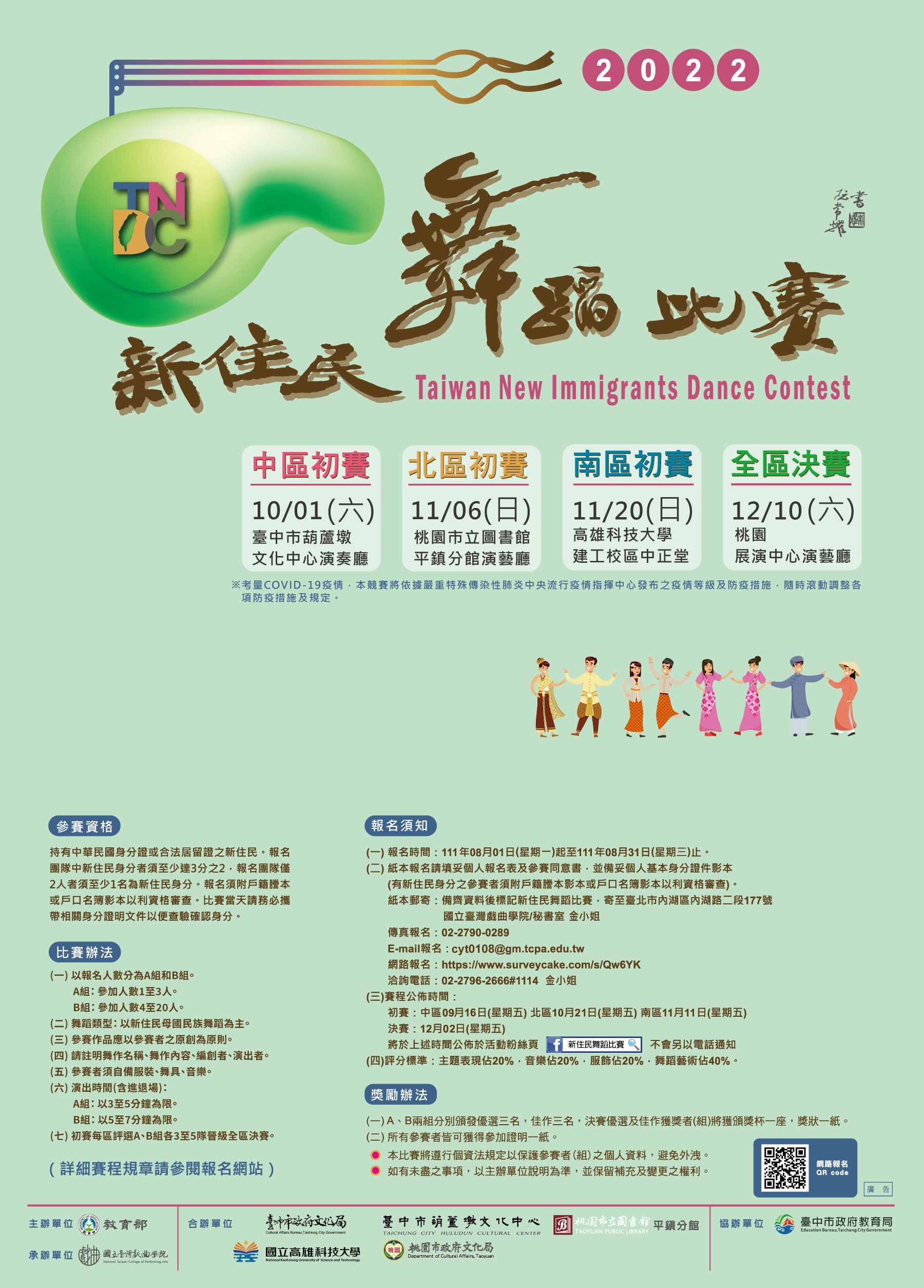 2.參賽資格:持有中華民國身分證或合法居留證之新住民。報名團隊中新住民身分者須至少達3分之2,報名團隊僅2人者須至少1名為新住民身分。