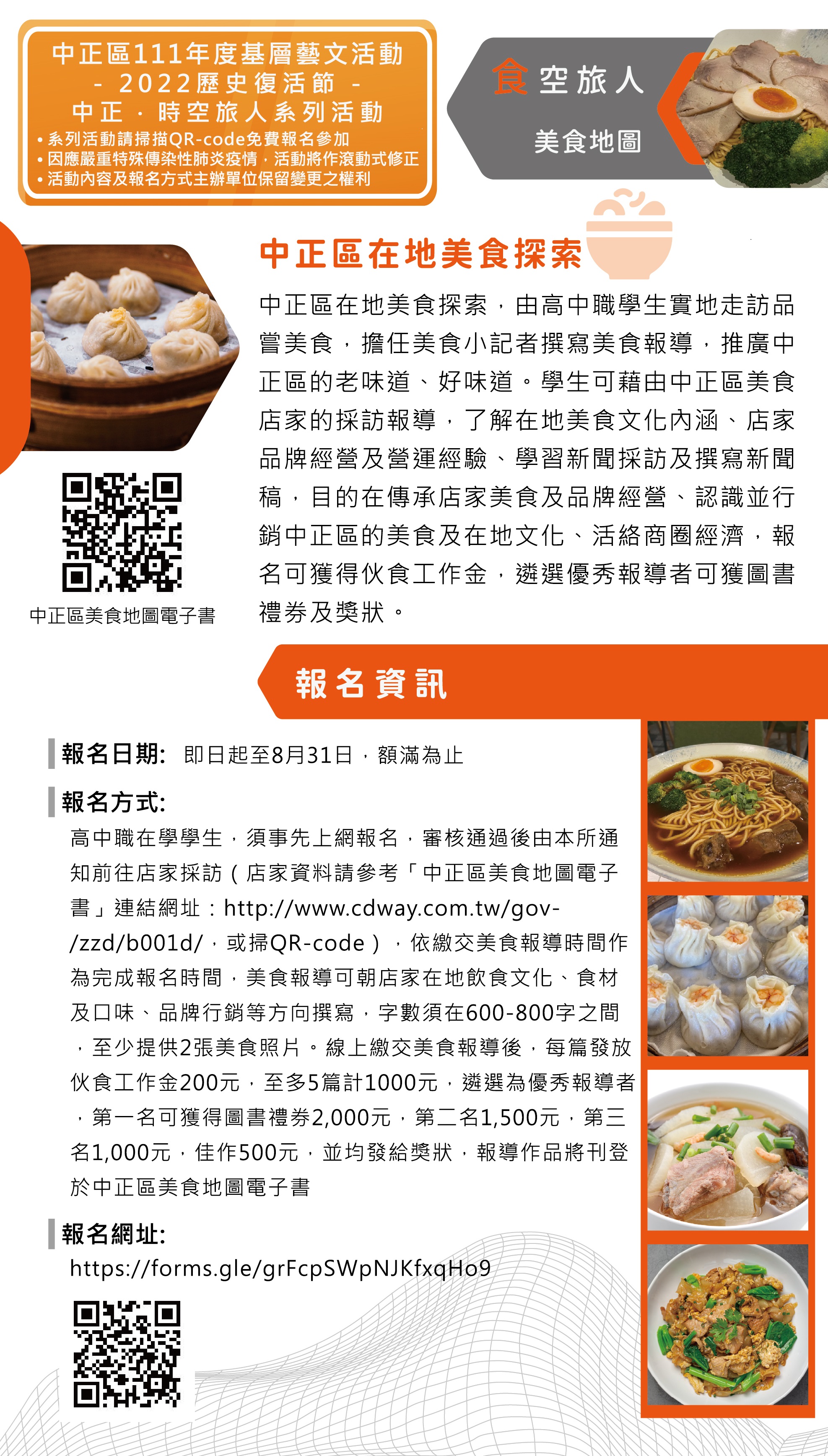 臺北市中正區已有專屬的美食地圖電子書! (http://www.cdway.com.tw/gov/zzd/b001d/ )歡迎點擊按圖索驥,來當中正區的「食」空旅人,實地探訪推廣中正區的老味道、好味道!歡迎高中學生報名中正區境內美食地圖小記者,了解在地美食文化內涵、店家品牌經營及營運經驗,學習新聞採訪及撰寫新聞稿,還能領取豐富工作獎金、競賽禮券,獲取公共服務時數,絕對讓你滿載而歸!