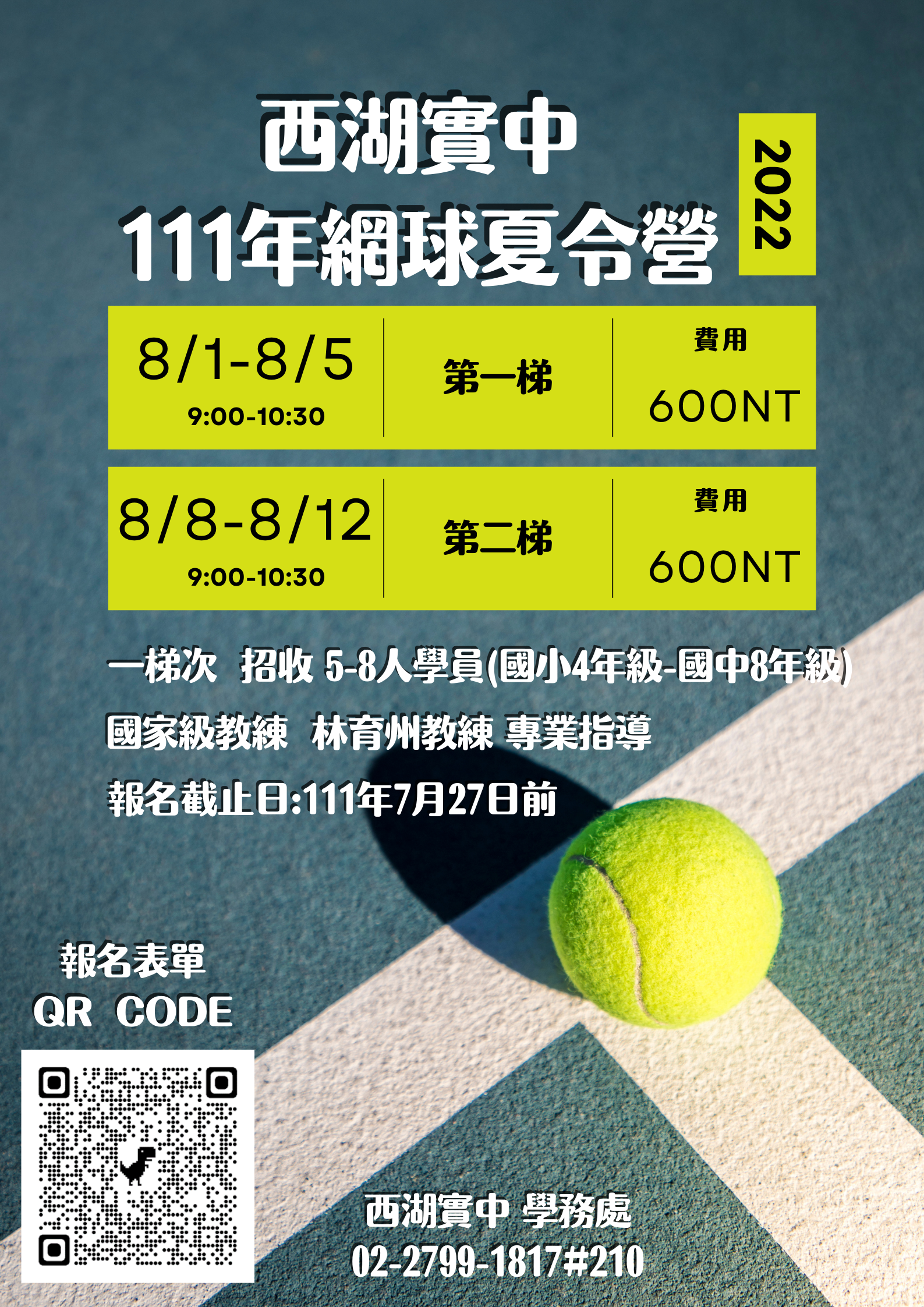 臺北市立西湖國民中學111學年度暑期開辦網球夏令營活動,請踴躍參加! 詳如附件!