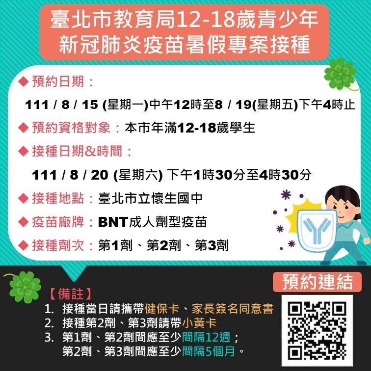 更正111年8月20日(星期六)假本市懷生國中辦理12 至18歲學生新冠肺炎疫苗暑假專案接種預約登記文宣一 案,第1劑、第2劑應間隔至少12週,第2劑、第3 劑(追加劑)應間隔至少5個月。修正後專案接種預約登記文及宏恩醫院預約教學方式,詳如附件!更正111年8月20日(星期六)假本市懷生國中辦理12 至18歲學生新冠肺炎疫苗暑假專案接種預約登記文宣一 案,第1劑、第2劑應間隔至少12週,第2劑、第3 劑(追加劑)應間隔至少5個月。修正後專案接種預約登記文及宏恩醫院預約教學方式,詳如附件!