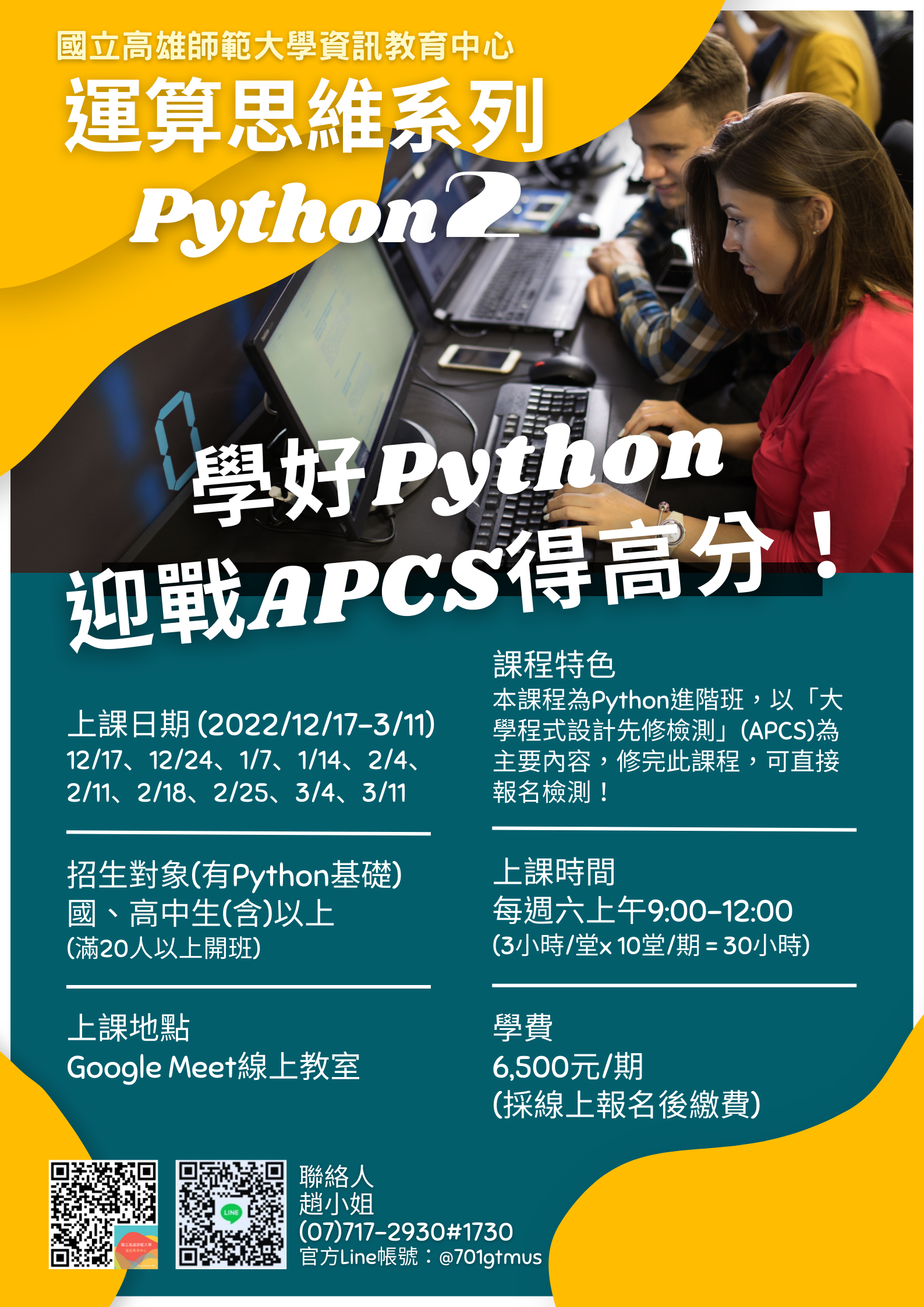 4、Python程式語言 2 (上課日期:2022/12/17-2023/3 /11)。