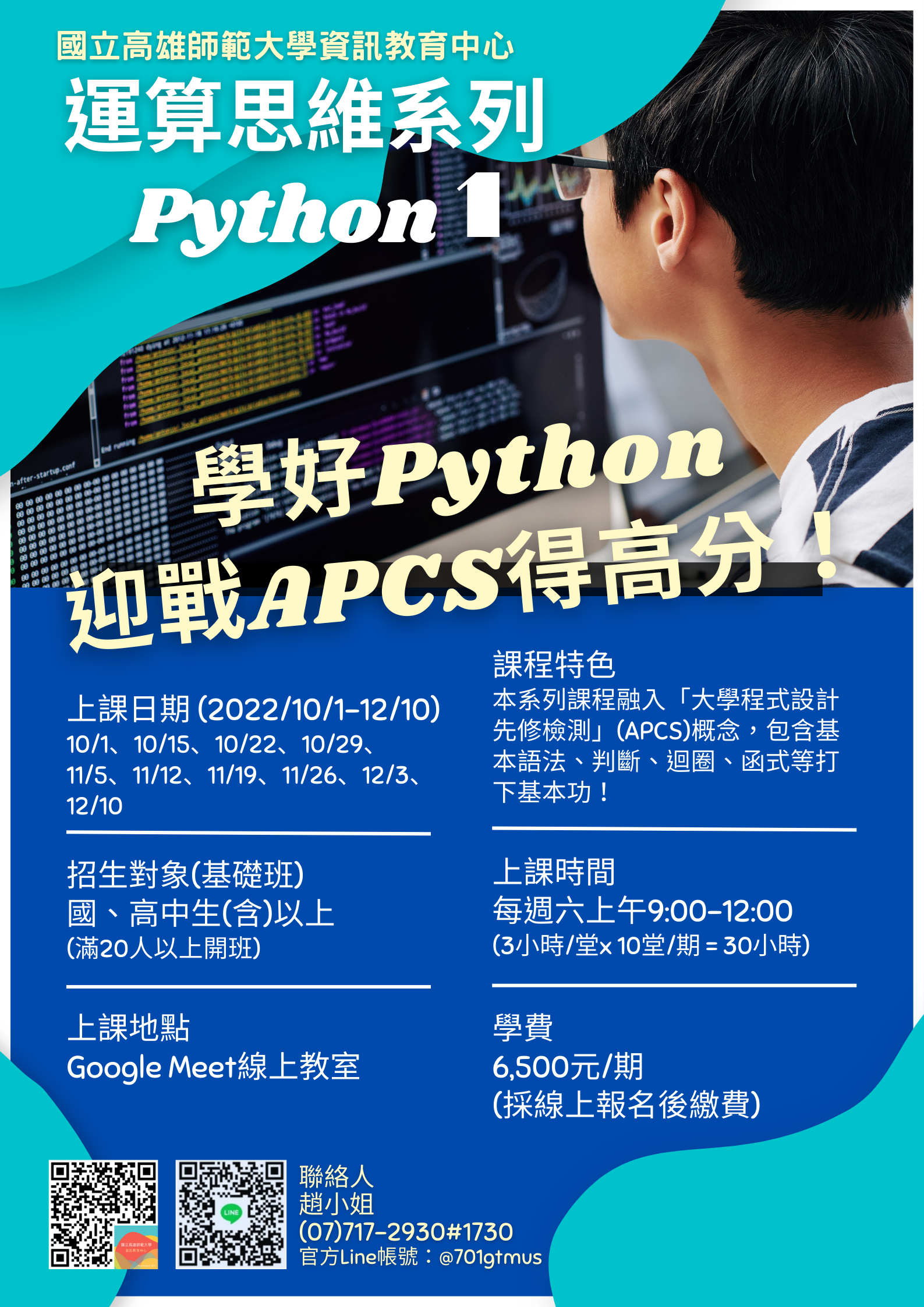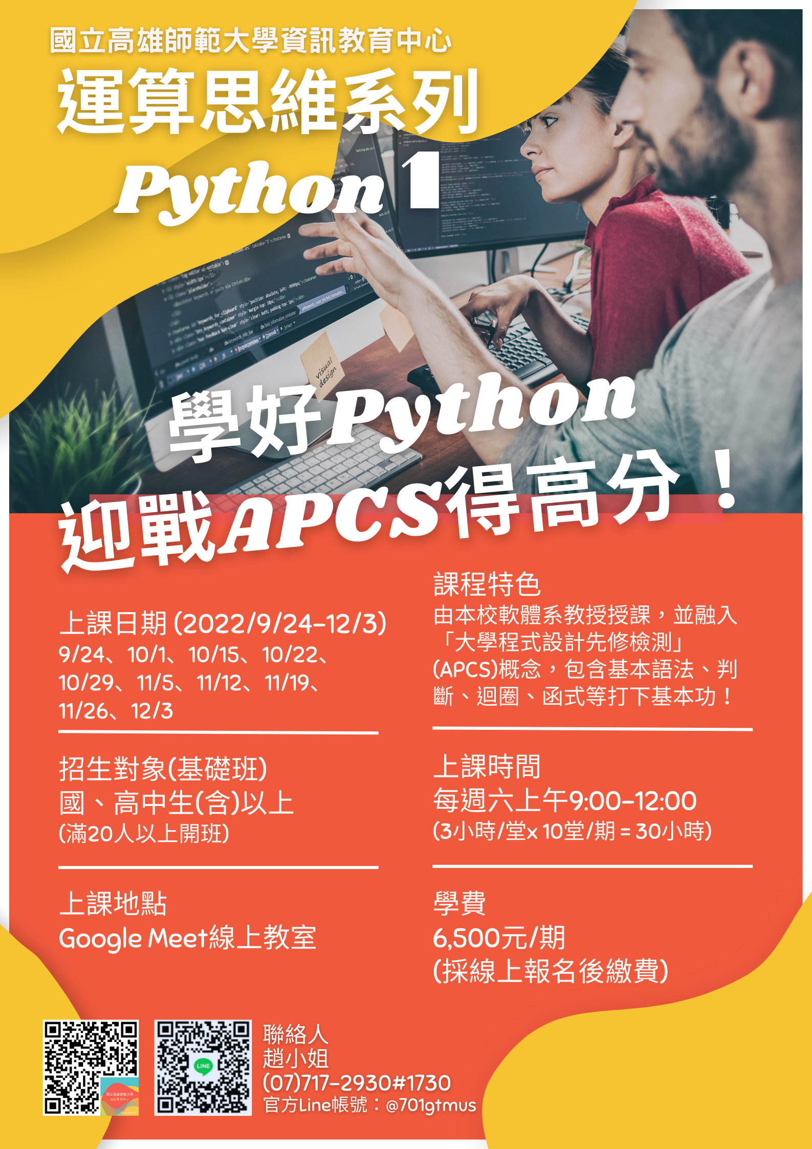 1、Python程式語言 1 (上課日期:2022/9/18-11/27)。