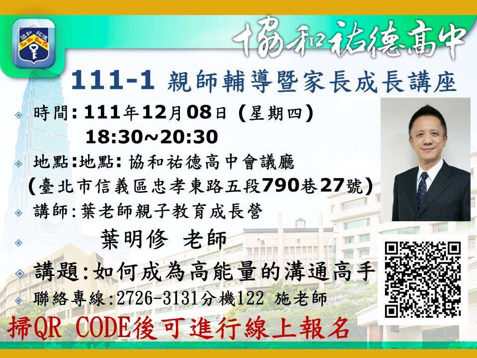 111學年度第1學期親師輔導暨家長成長講座研習,請教職員及家長踴躍報名參加!詳見附件