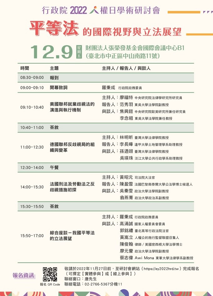 為使各界了解國際人權之趨勢及拓展對平等法的國際視野,行政院人權及轉型正義處訂於2022年國際人權日,以 「平等法的國際視野與立法展望」為主軸,舉辦旨揭學術研討會。