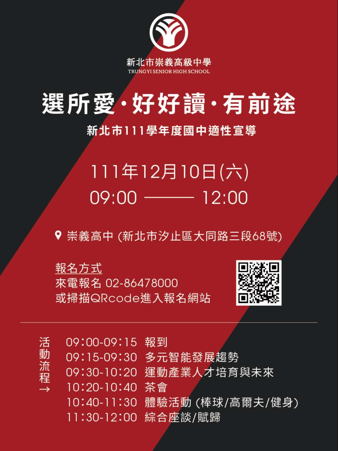 崇義學校財團法人新北市崇義高級中學辦理「選所愛、好好讀、有前途」新北市111學年度國中家長技職教育宣導研習,歡迎同學與家長踴躍報名參加。詳如附件