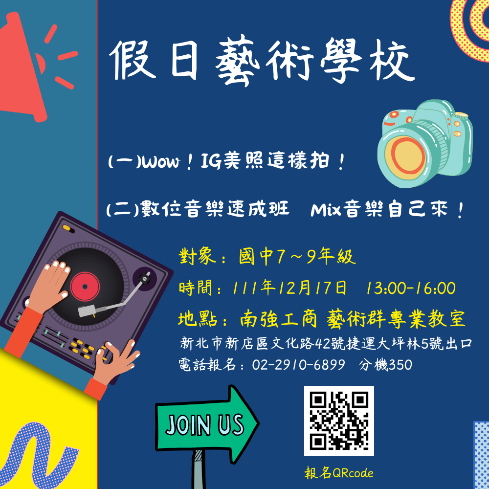 新北市私立南強高級工商職業學校辦理「假日藝術學校」之職業試探體驗課程,請學生踴躍參加。詳如附件