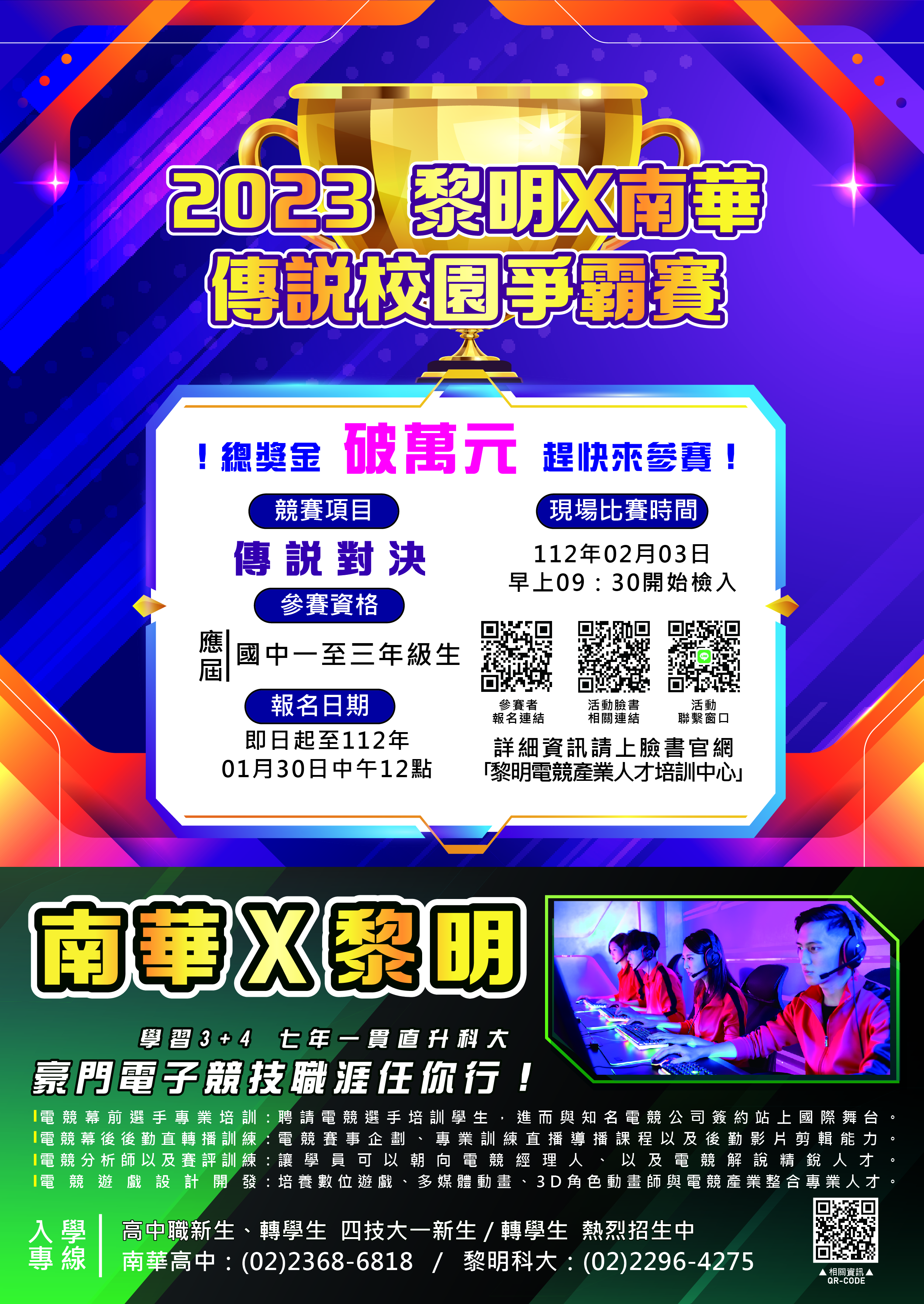 特別舉辦2023黎明-南華高中【最強傳說校 園賽】電競大賽,廣邀國一至國三學生一起來挑戰。