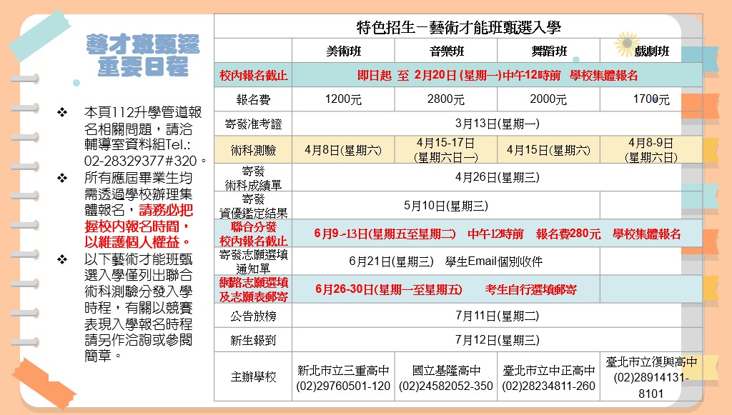 112升學《藝術才能班簡章》公告,簡章連結如下方附件處,請同學把握報名時間,以維護個人升學權益。 1.校內報名期限為2月20日中午12時前。 2.藝才班報名請洽輔導室資料組28329377分機320