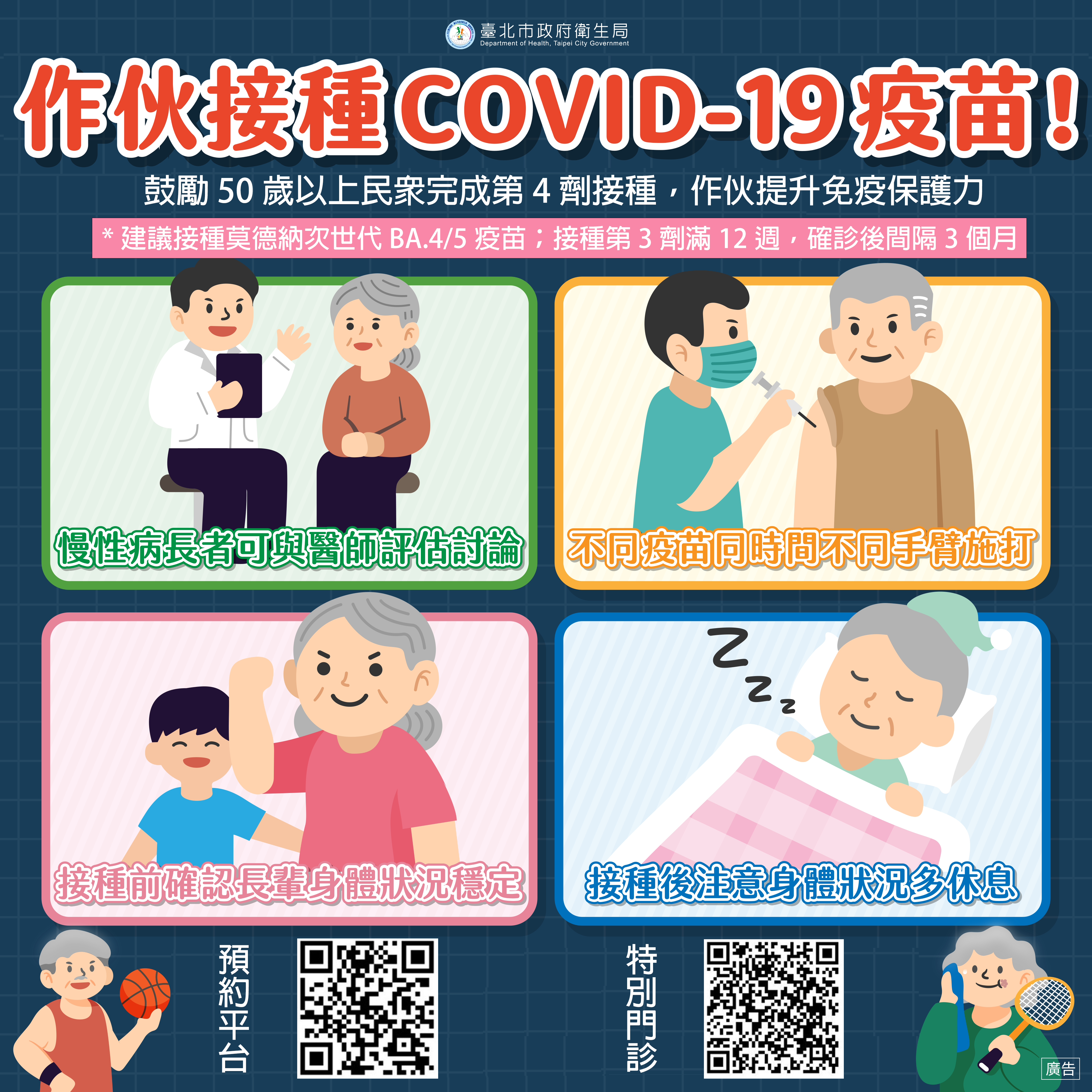 轉知為提升本市50歲以上民眾COVID-19疫苗第4劑(第2次追加 劑)接種涵蓋率,請符合接種資格對象儘速完成接種