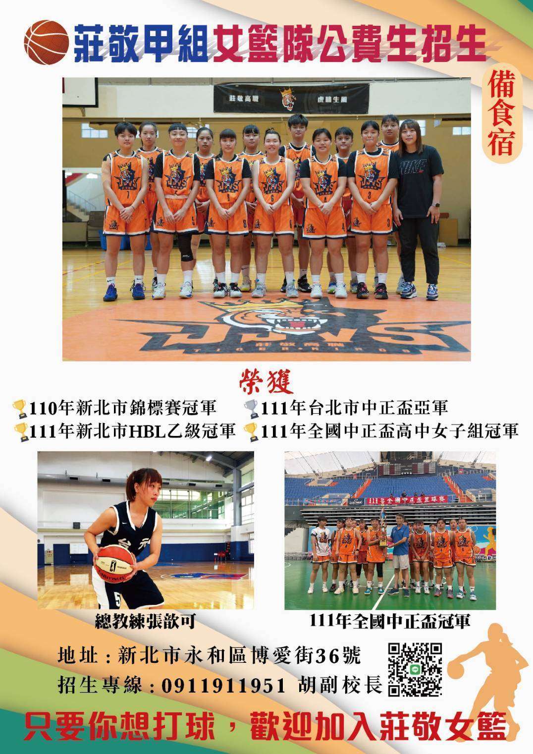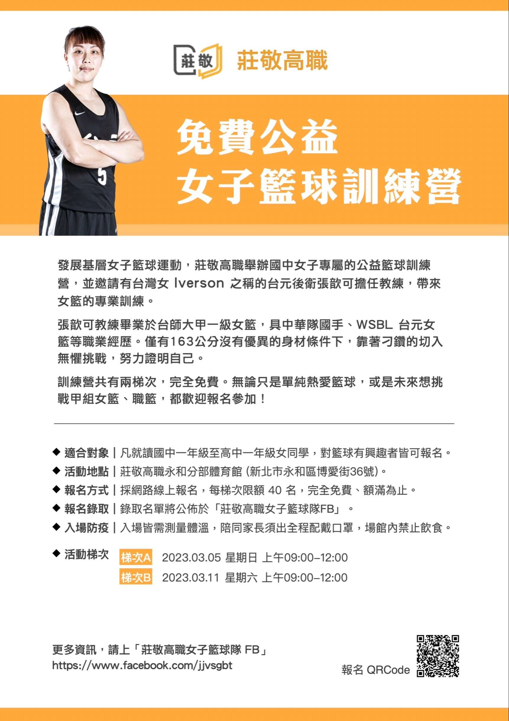 轉知新北市私立莊敬高級工業家事職業學校「莊敬高職免費公益女子籃球訓練營」活動及報名辦法與DM乙張,請踴躍報名