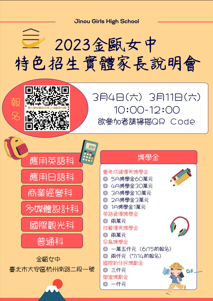 一、該校定於民國112年3月4日(星期六)、3月11日(星期六)上 午10時至12時假該校英語情境教室辦理【特色招生家長說明會】活動,歡迎家長及學生報名參加,需遵守相關防疫規定。