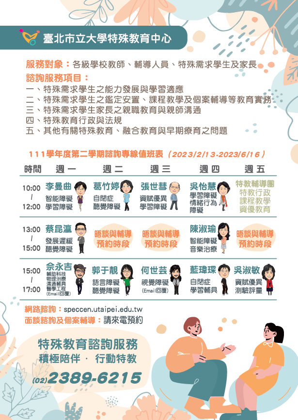詳情請至中心網站(speccen. utaipei.edu.tw)或電話查詢。