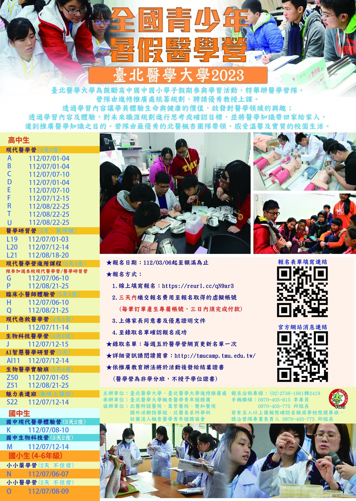 臺北醫學大學「臺北醫大學2023全國青少年暑期醫學營,請同學踴躍參與!