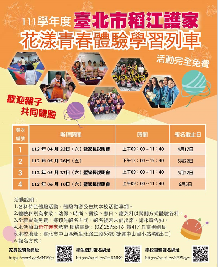 二、本學期於112年4月22日(六)、5月26日(五)、5月27日 (六)、6月10日(六)辦理「稻江護家花漾群科體驗活動」, 誠摯邀請八、九年級學生參加。