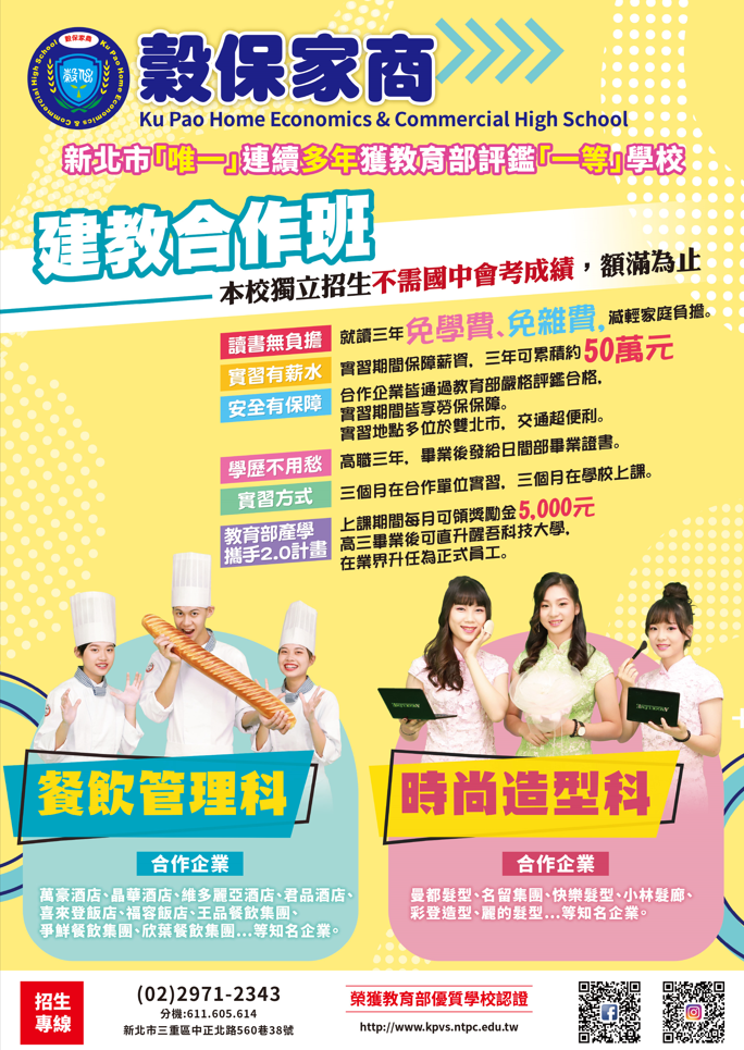 一、穀保高級家事商業職業學校建教合作班為新北市唯一連續六年評鑑一等的優質學 校,招生科別:輪調式時尚造型科及輪調式餐飲管理科。