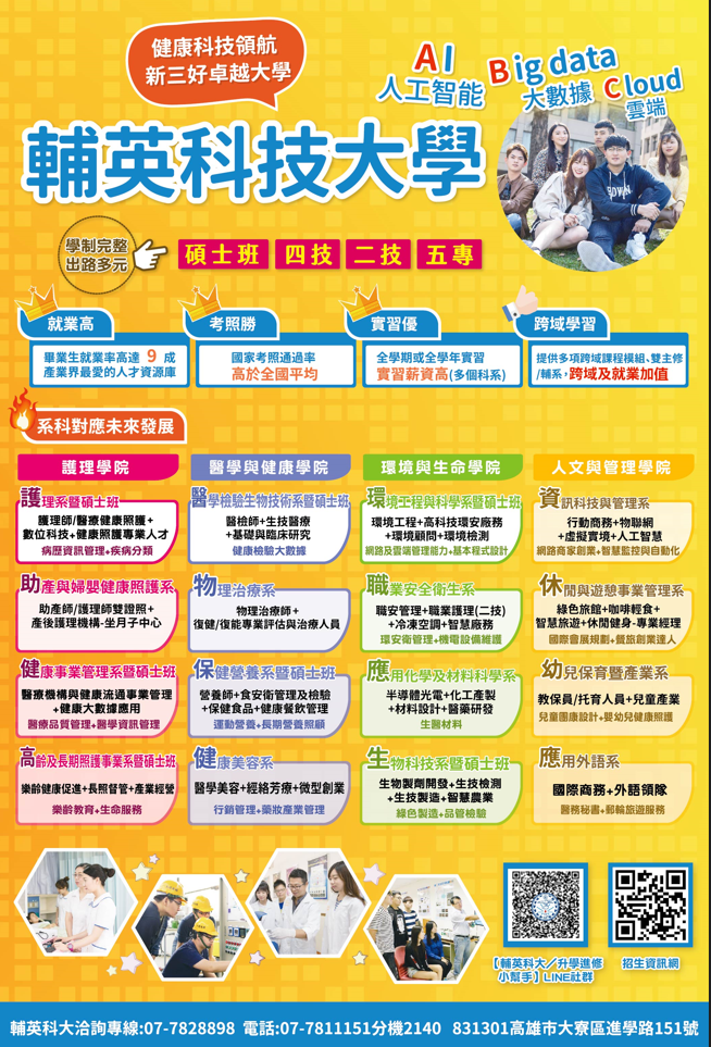 一、輔英科技大學設有五專、二技、四技、碩士班,學制完整,出路多元,有利學生升學及就業。
