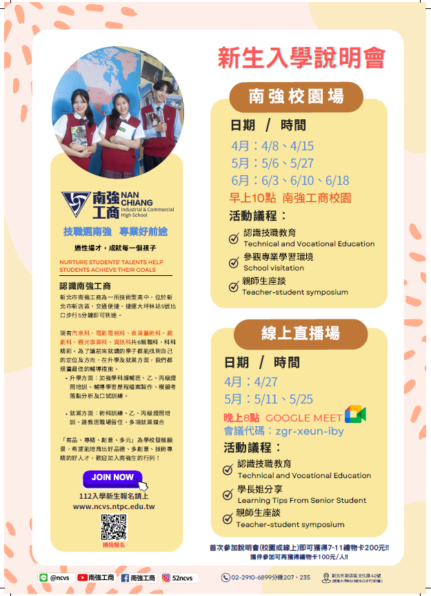 三、課程主題:認識技職教育、建教班及原住民實驗班說明、專業學習環境介紹與親師生意見交流,歡 迎想要了解技職教育的國中學生及家長(不限年 級) ,