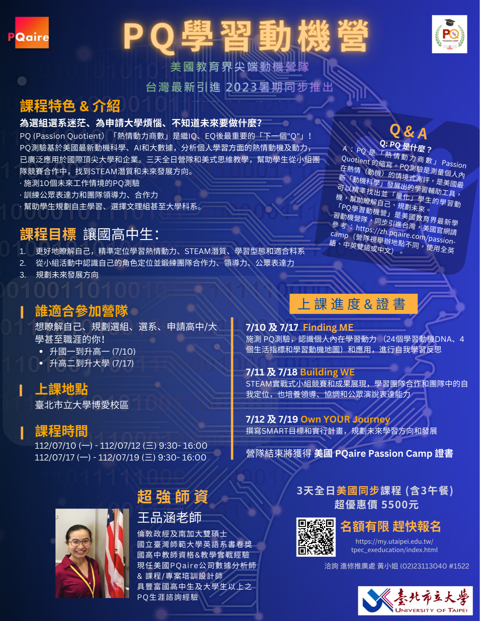 一、課程特色:PQ基於美國最新動機科學、AI和大數據分析個 人學習熱情動力,已廣泛應用於國際頂尖大學和企業。三 天全日營隊和美式思維教學,幫助學生從小組團隊競賽合 作中,找到STEAM潛質和未來發展方向。