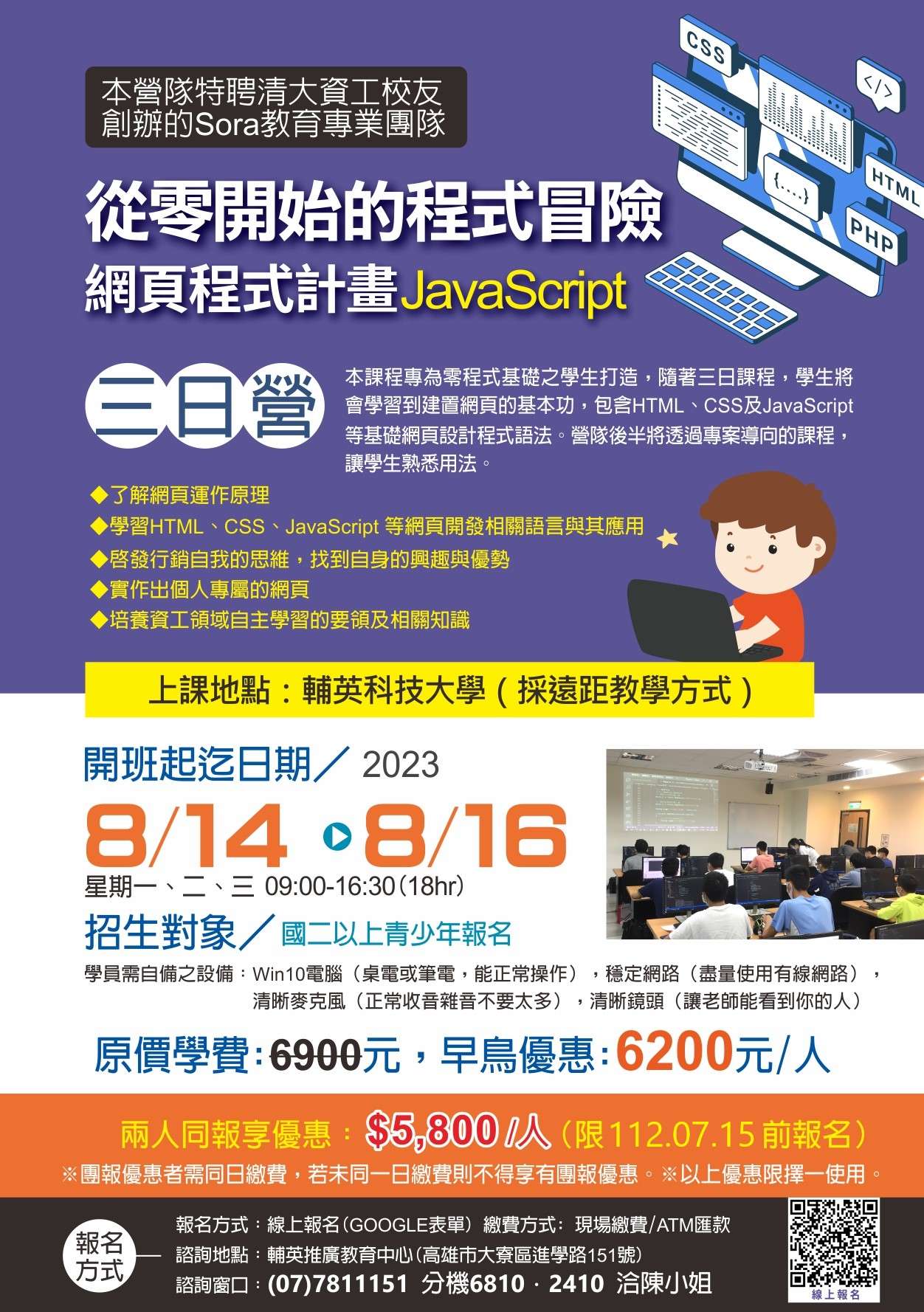 一、課程特色:本課程專為零程式基礎之學生打造,隨著三日 課程,學生將會學習到建置網頁的基本功,包含 HTML、 CSS及JavaScript等基礎網頁設計程式語法。營隊後半將透 過專案導向的課程,讓學生熟悉用法。