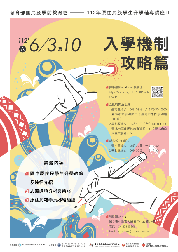 四、若針對本次講座有任何疑問,請洽詢國立臺中教育大學原 住民族教育及文化研究中心鄭小姐,電話:04- 22183398,電子信箱:chuchien@mail.ntcu.edu.tw。